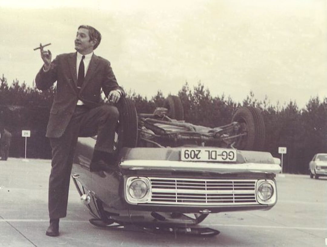 This is a famous picture of a young Bob Lutz. As the story goes, he had disagreed with some German engineers about whether the Opel Kadett could survive a J-turn without flipping. Lutz got into the car and demonstrated a J-turn, the Kadett subsequently ended up on its roof, proving his point. Image courtesy of General Motors.