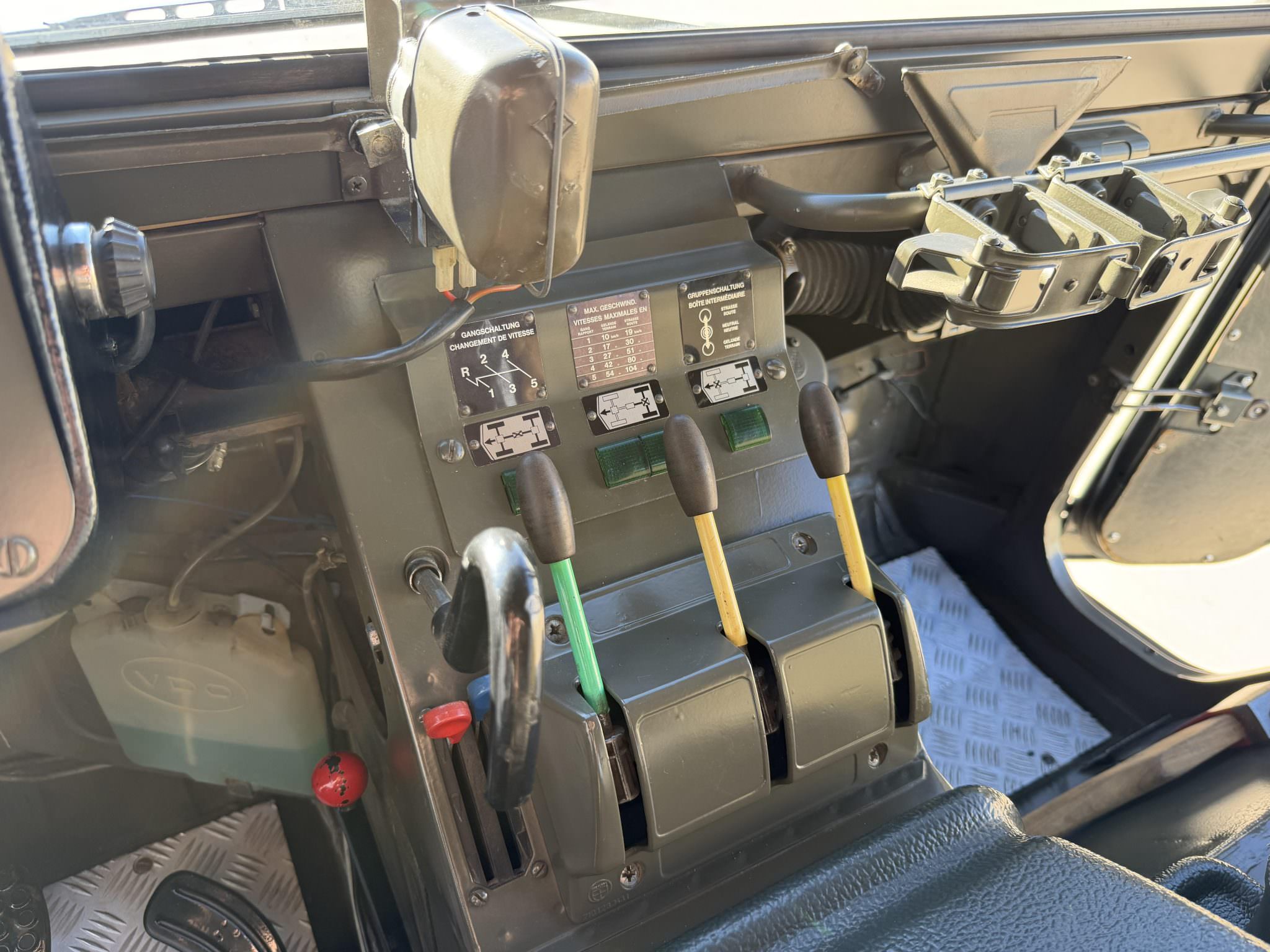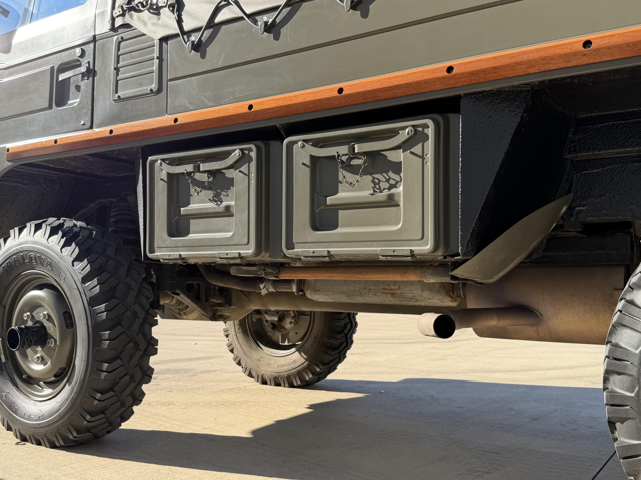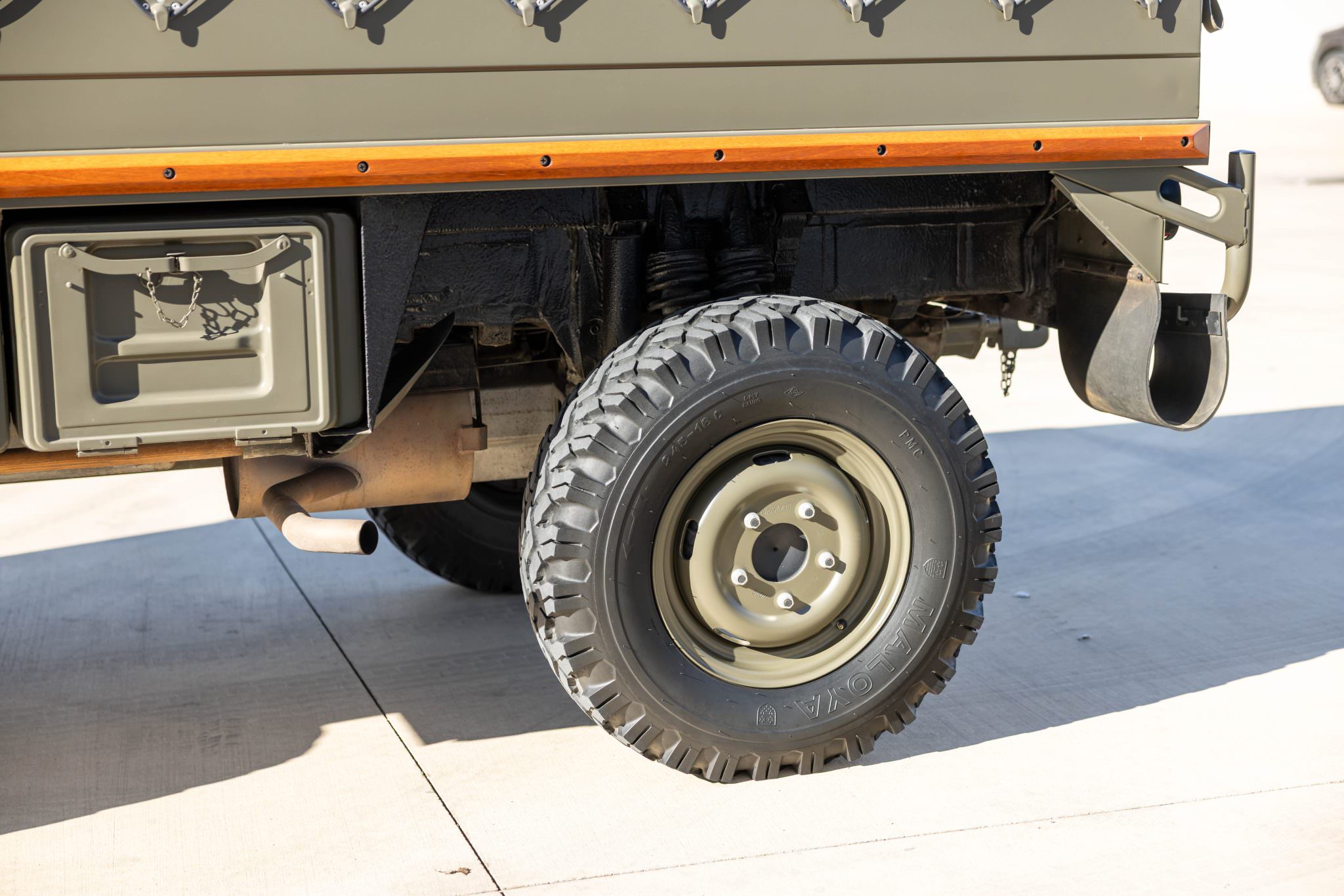 It rides on 16 inch steel wheels fitted with 245 series Maloya tires and it’s equipped with four-wheel drum brakes. Power comes from an air-cooled 2.5 liter inline four producing a factory-rated 87 bhp and 133 lb ft of torque. This engine is paired with a 5-speed manual transmission and a dual-range transfer case, sending power through portal axles and three hydraulically locking differentials.