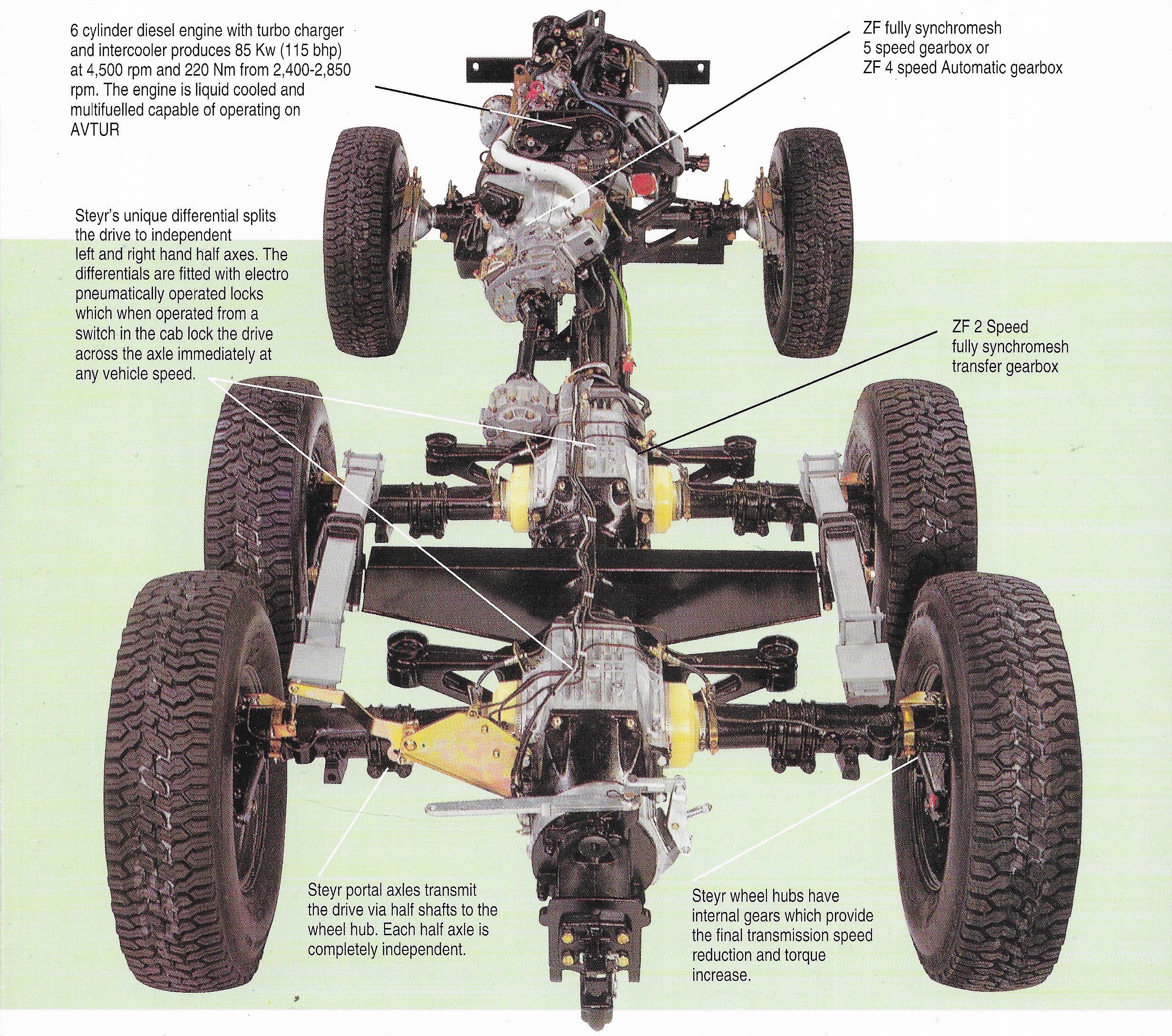 Power for early Pinzgauers was a Steyr-designed, air-cooled inline four petrol engine rated at 87 bhp and 133 lb ft of torque. A 5-speed manual transmission was standard. These power figures were modest on paper, but it goes without saying that the vehicle was developed for controlled cross-country capability rather than any sort of outright speed.