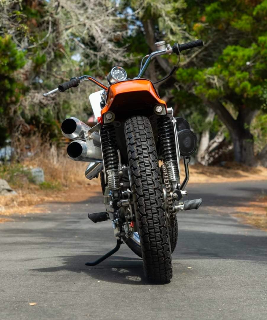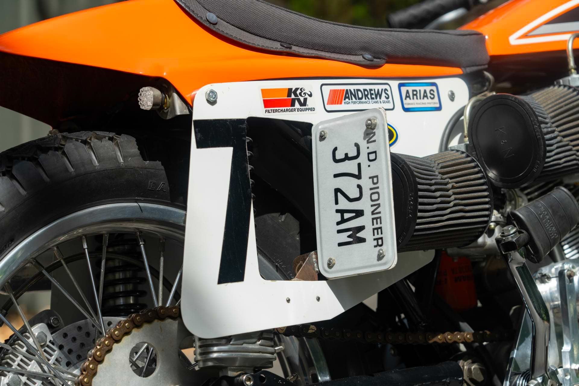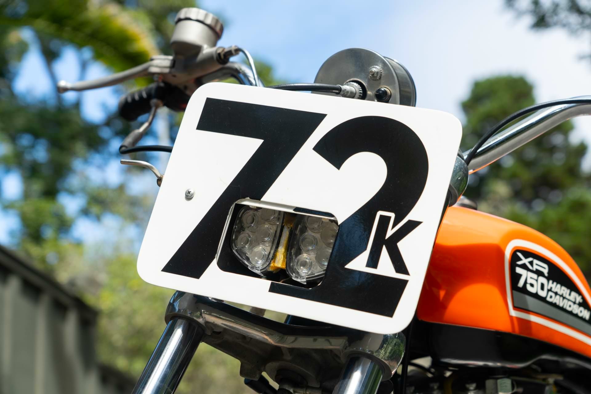 The motorcycle you see here is a 1972 Harley-Davidson XR750 that has been discreetly customized by John Steel to make it road legal. It now has a headlight hidden behind a moving panel in the front racing number plate, it has blinkers, rear lights, and a clever rear road license plate that folds out of the side racing number plate.