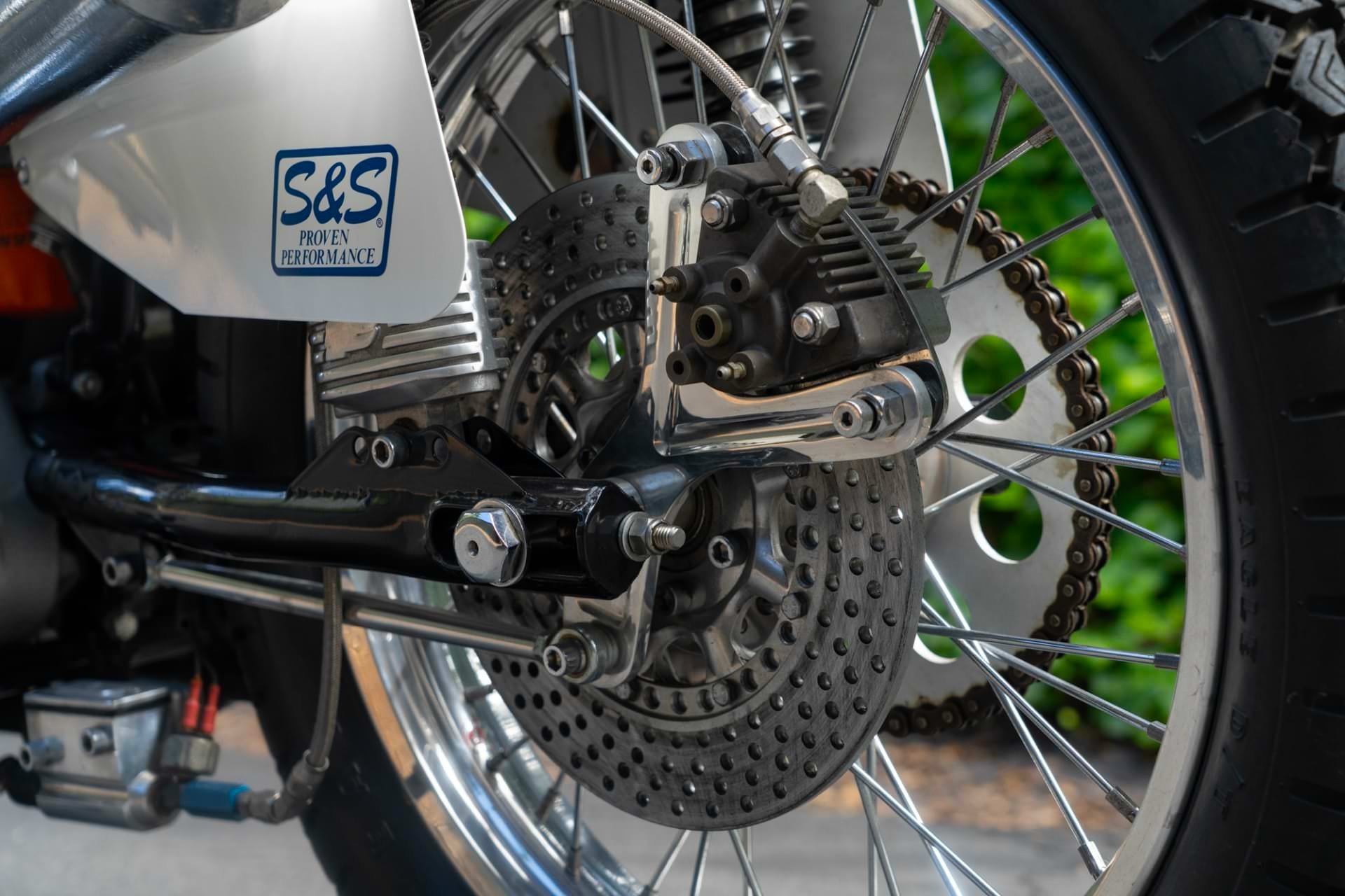 Braking was minimal by design – pure flat track XR750s ran without a front brake, while TT and road-racing variants were equipped with front brakes more appropriate to their discipline. Early XRTT machines used large four-leading-shoe drum brakes, with disc brakes appearing on later road-race and TT configurations as rules and technology evolved.