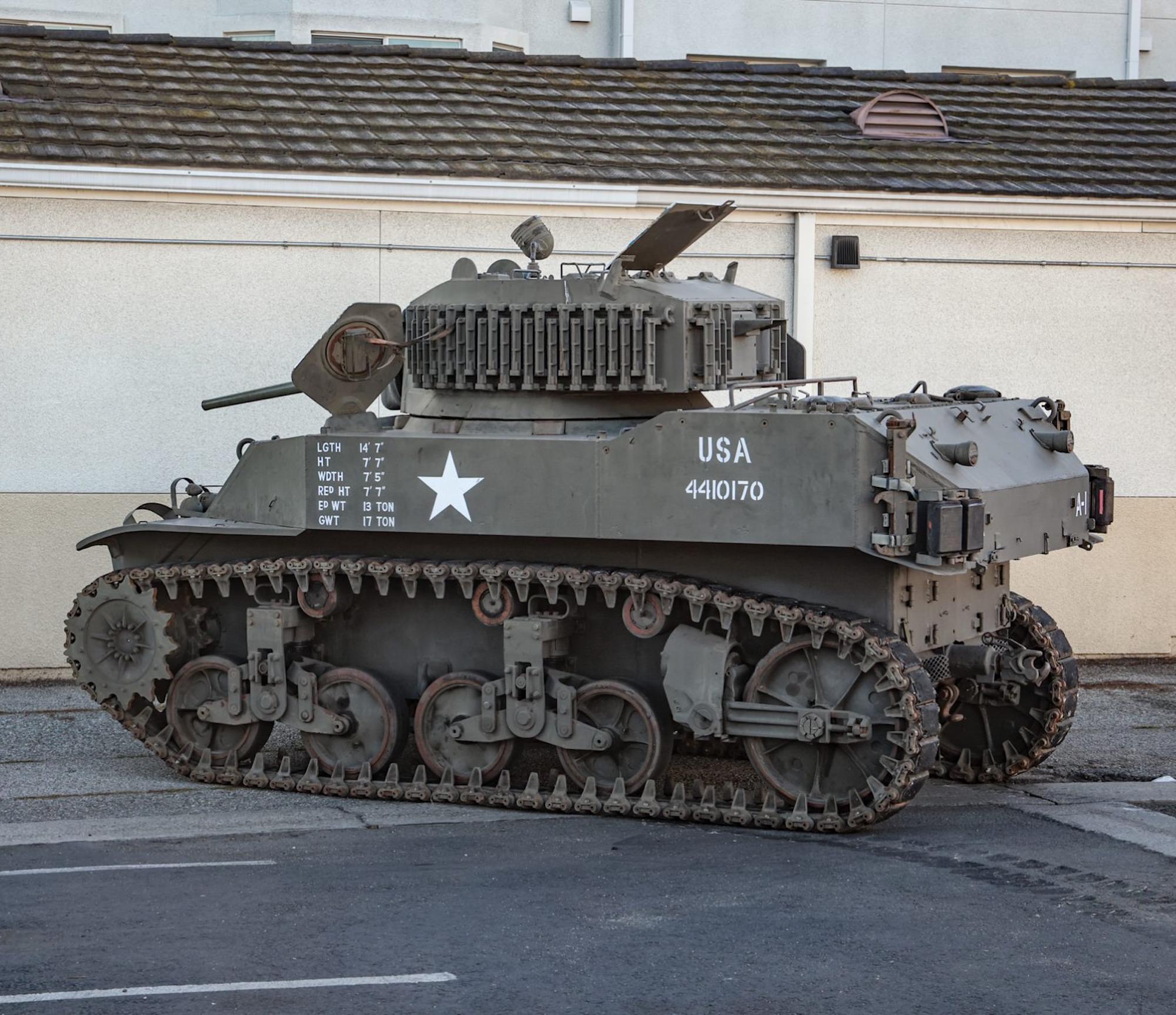 This is an original WWII-era 1943 Stuart M5A1 tank that remains in operational condition, with both its Cadillac L-head V8s in place and working, its main gun and machine guns have been decommissioned for obvious reasons.
