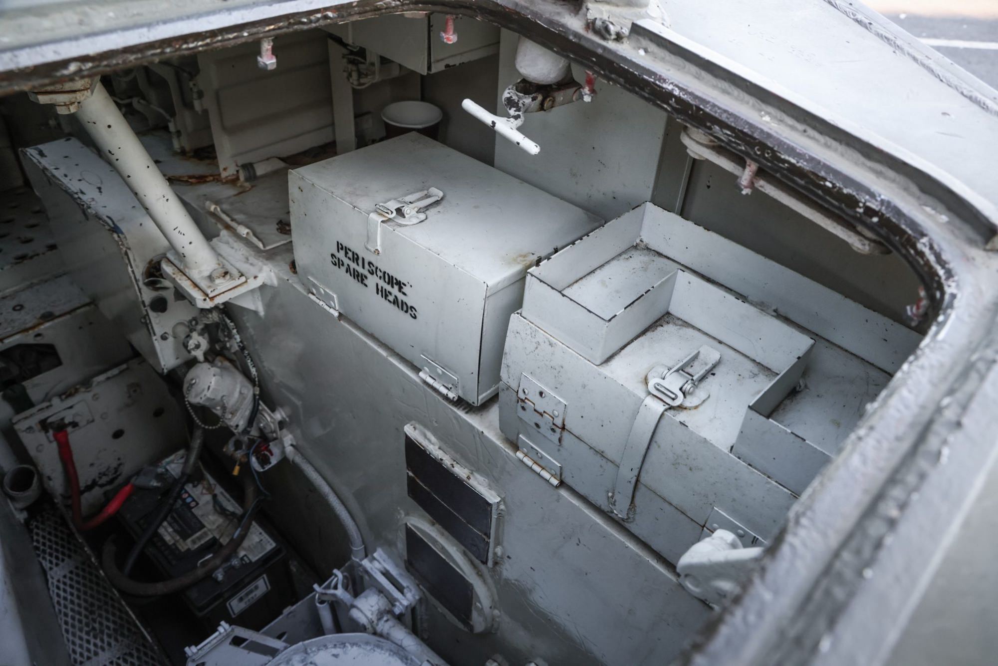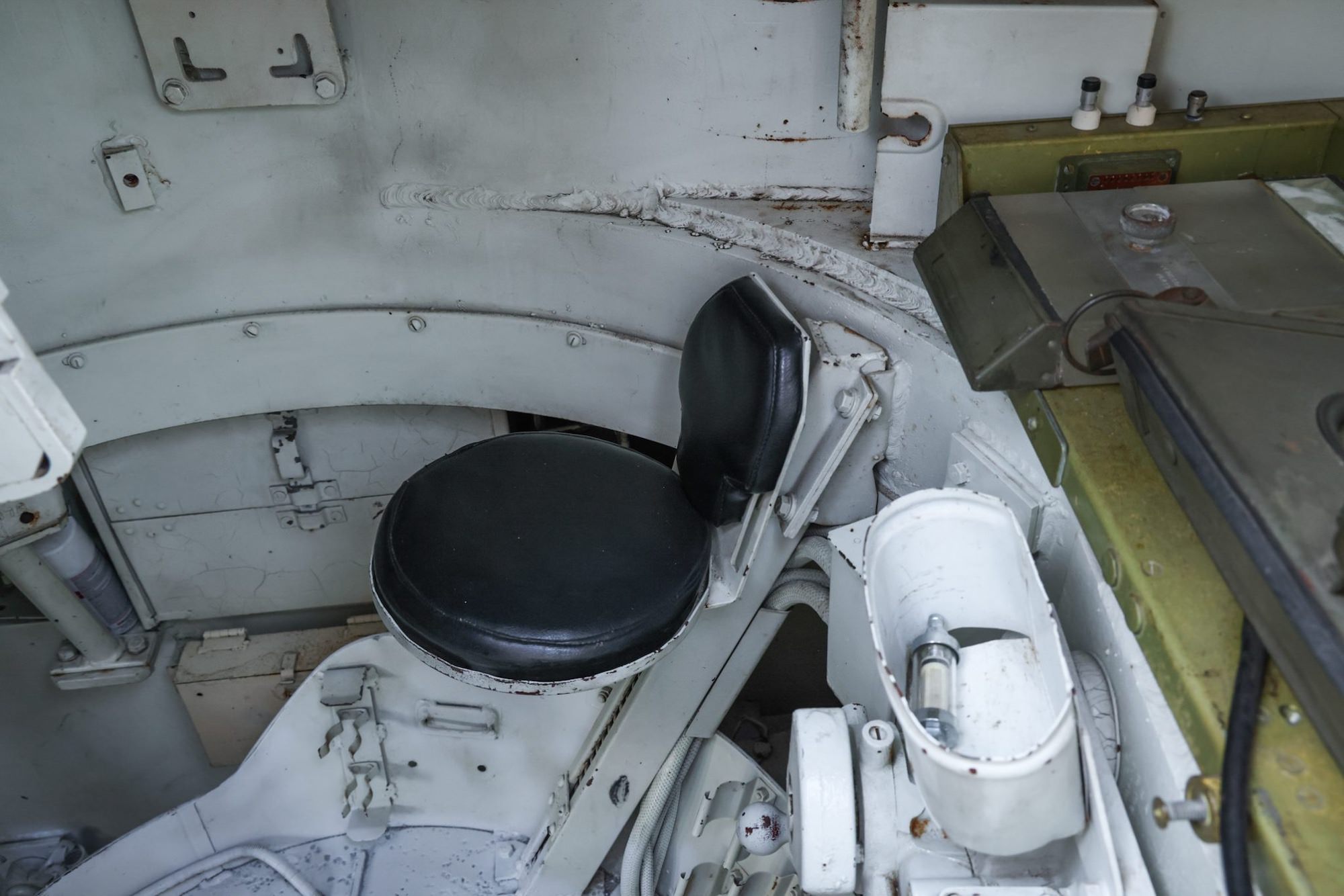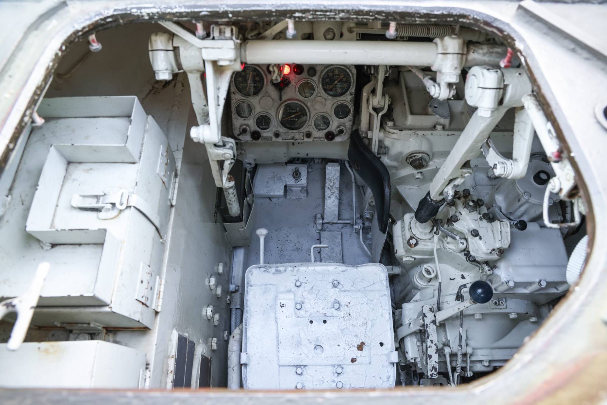 The interior is finished in white and keeps its original four-man configuration, with adjustable seats for a driver, co-driver, gunner, and commander/loader. Controls include ceiling-mounted tillers, a central instrument panel with dual tachometers, oil pressure and coolant gauges for each engine, and an (optimistic) 80 mph speedometer.