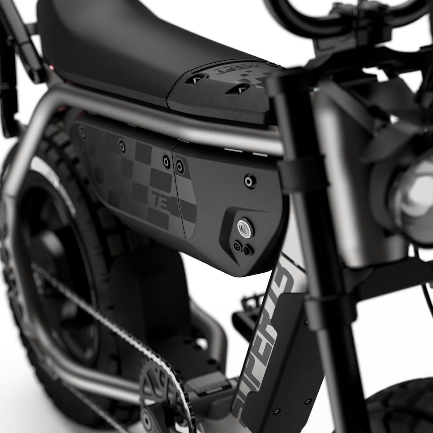 At 85 lbs, the MZFT isn’t a lightweight, but its centralized mass gives it a planted feel. It rolls on 16-by-4.5 inch Vee Jakal tires that give it a good balance between pavement grip and loose-surface stability, these tires also add some cushioning to the ride. The aluminum frame and rigid forks are finished in matte paintwork with understated graphics, and the bike keeps the minimalist headlight and tail unit that have become part of Super73’s styling signature.