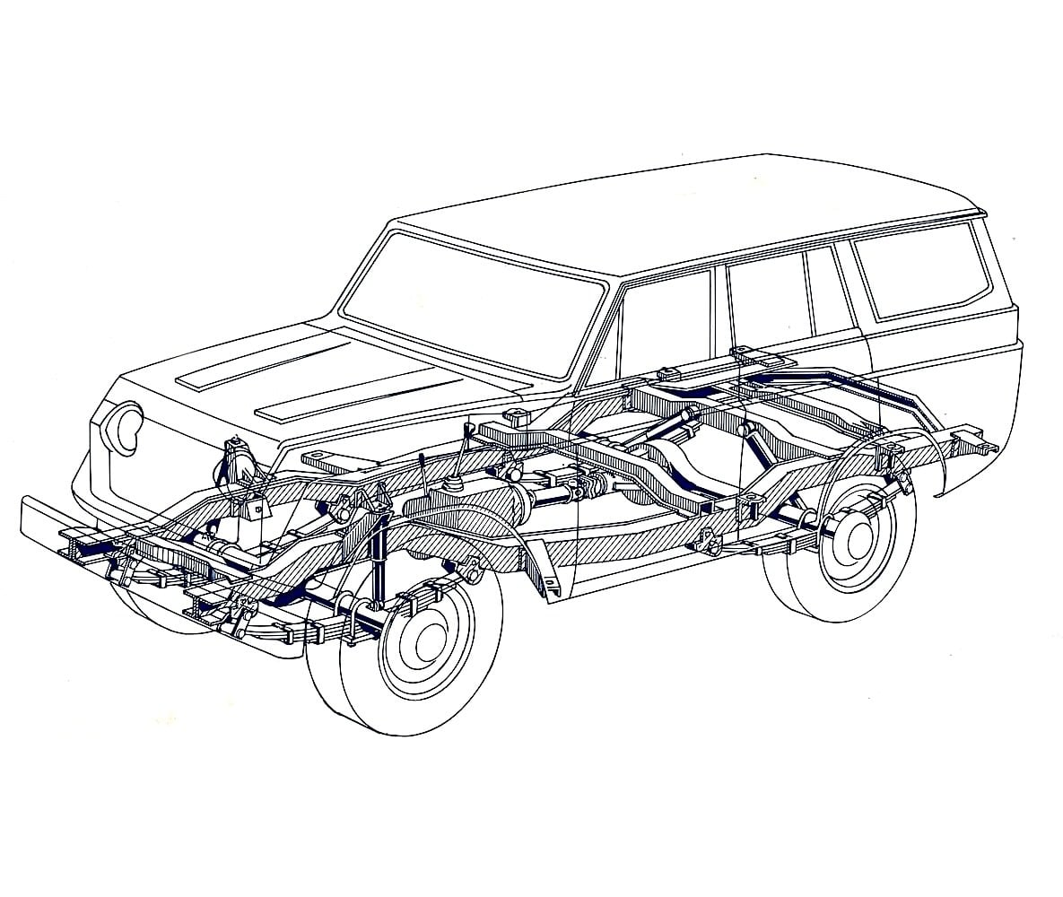 Mechanically, the FJ55 was closely related to the FJ40, sharing its axles and drivetrain but the chassis was a new design. It was the first Land Cruiser to use fully enclosed, boxed frame members – the new design used fewer cross-members than the FJ40 despite the longer wheelbase, but it still offered ~20% greater stiffness. Image courtesy of Toyota.