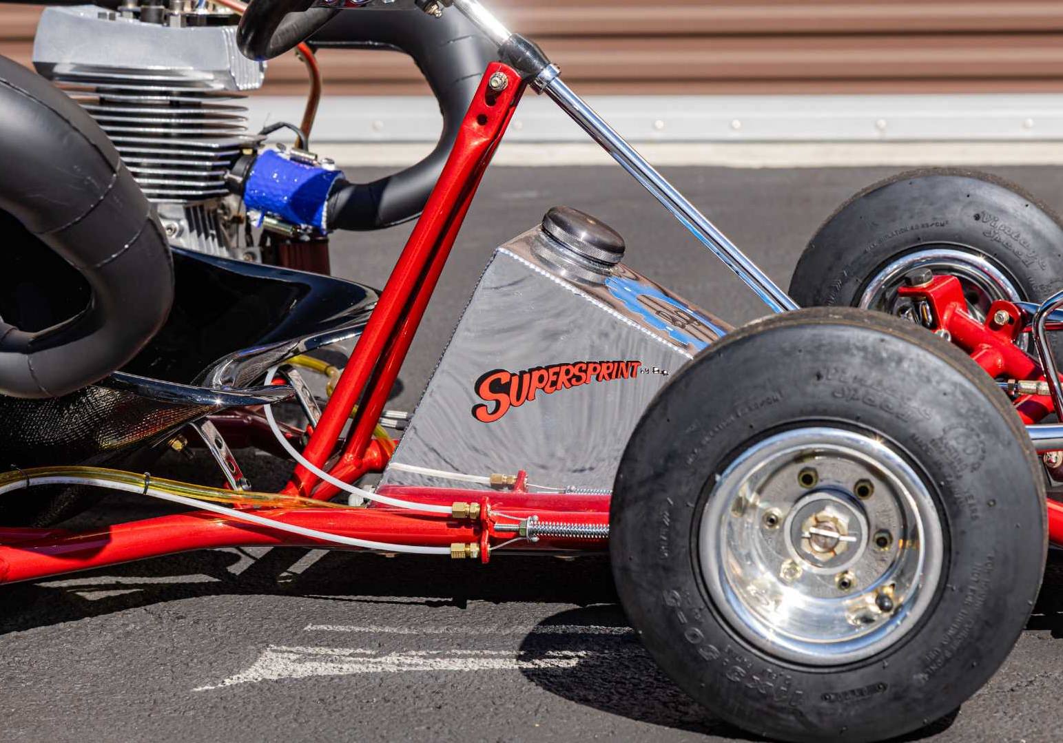 It now has all NOS steering components, a restored, correct Super Sprint steering wheel, and a chrome steering shaft and spindles. It has a hand-laid fiberglass floor pan with a black gelcoat, and a hand-laid molded fiberglass seat in black epoxy.