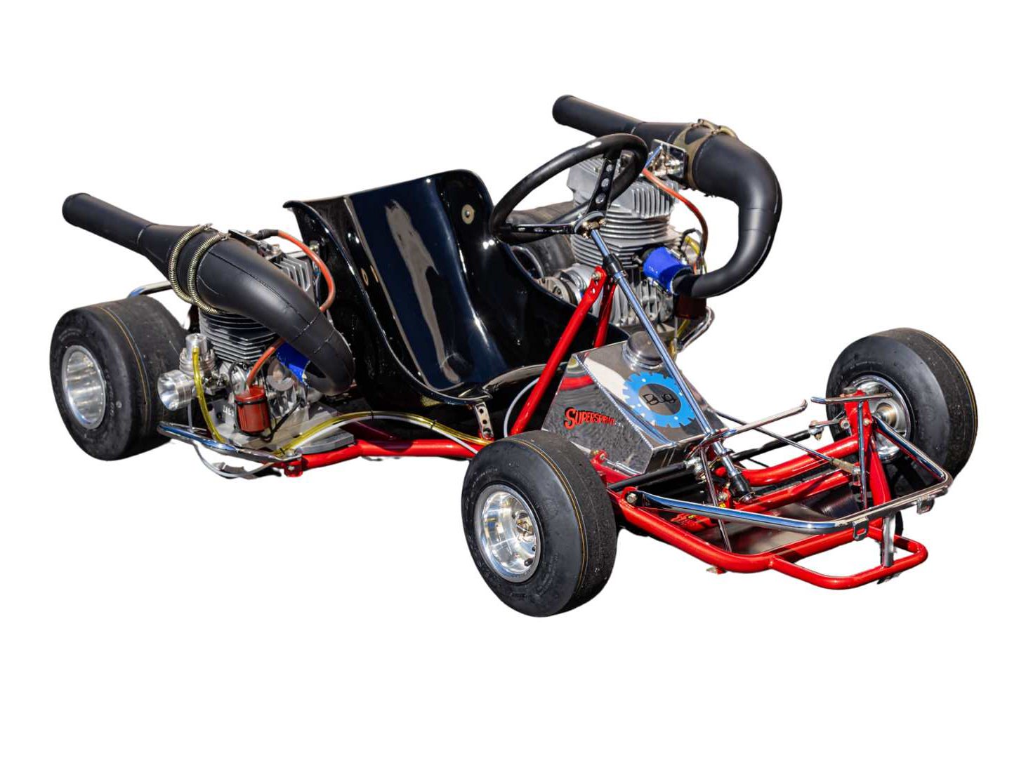 This kart was built by World Kart Champion Lake Speed from two matching NOS factory engines and it was recently refreshed after a period of time in storage. Power is provided by dual K99 Komet B-Bomb 135cc two-stroke engines – these are among the most sought-after kart engines in the world.