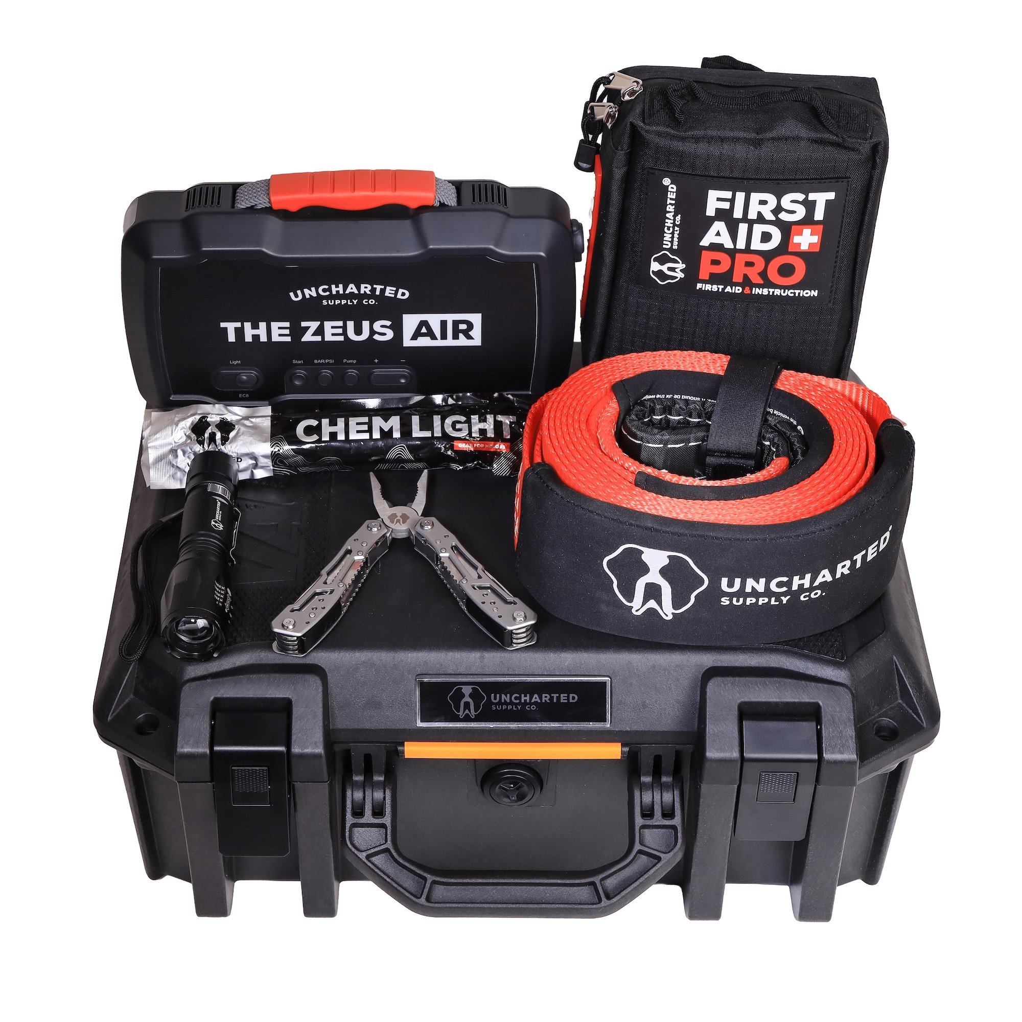 Inside the Pelican case you’ll find a slew of items including a Zeus Air that can jump start engines up to 6.0 liter diesels, inflate tires, and more. You’ll also find a First Aid Pro Kit, a static tow strap rated to 17,500 lbs, a survival-ready multitool, and more.