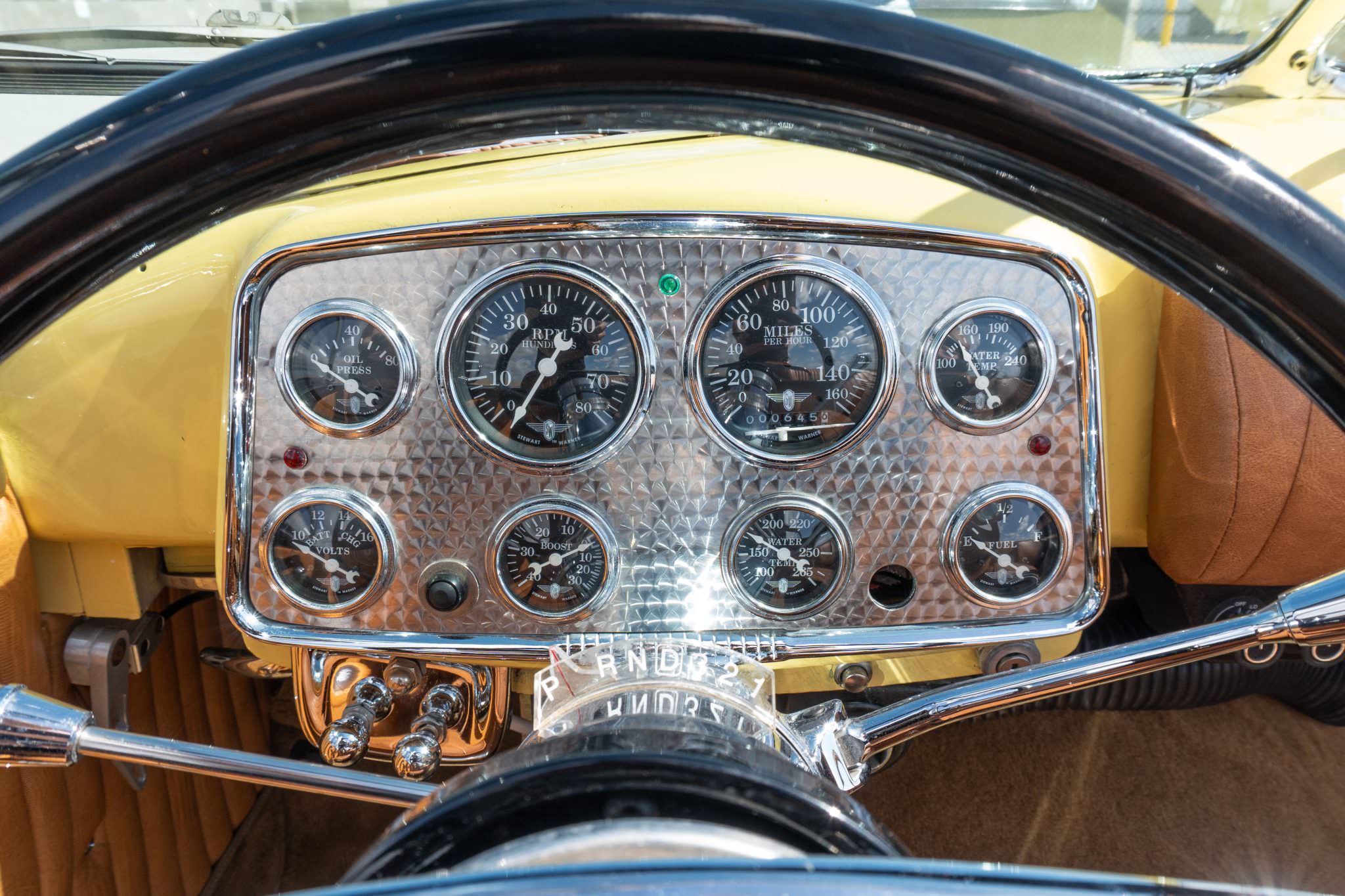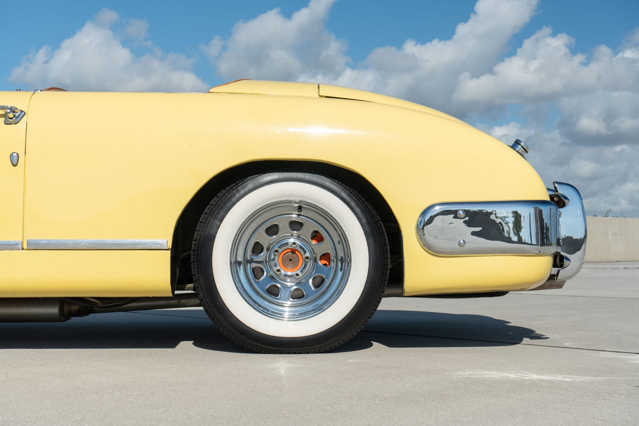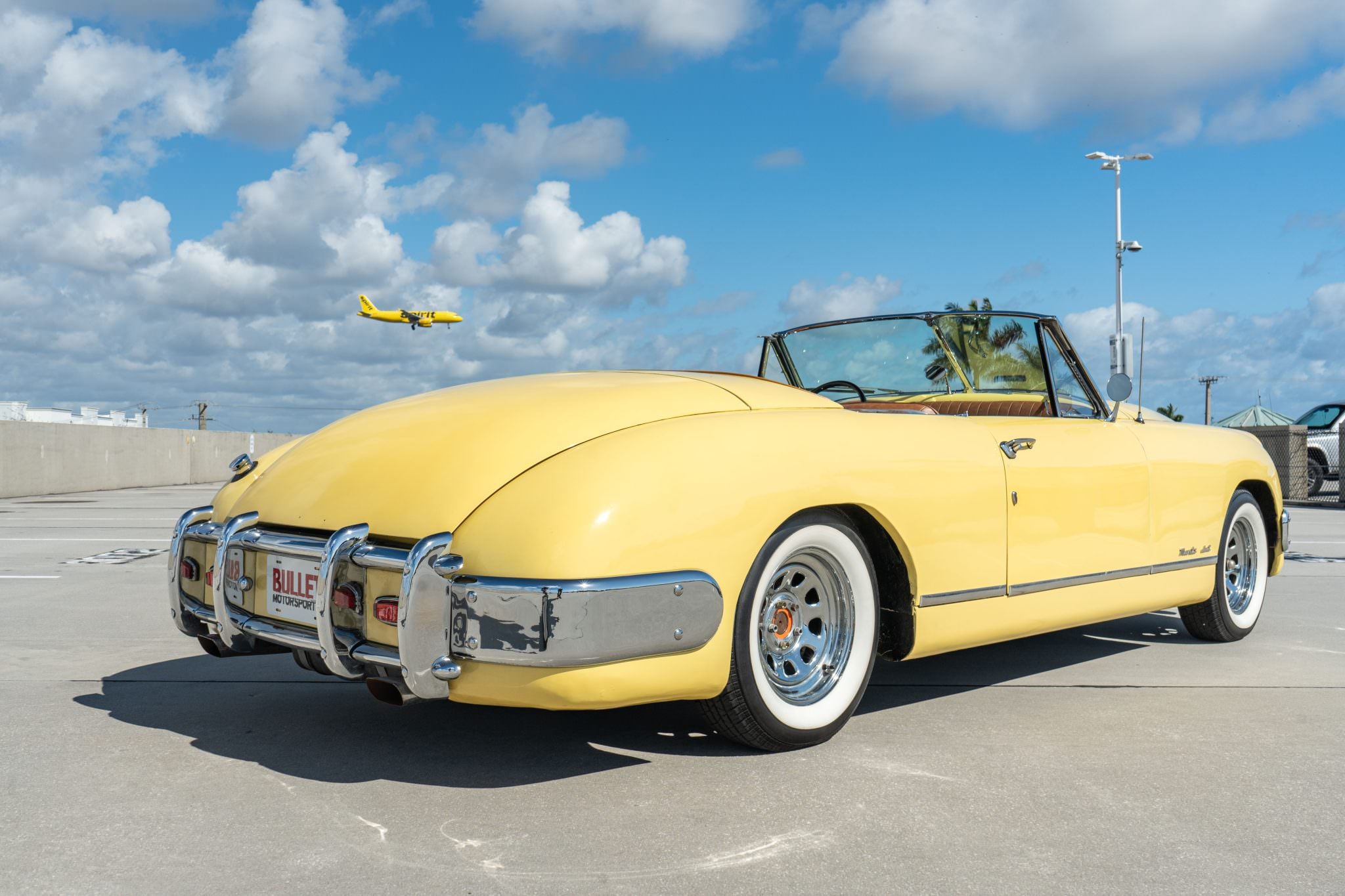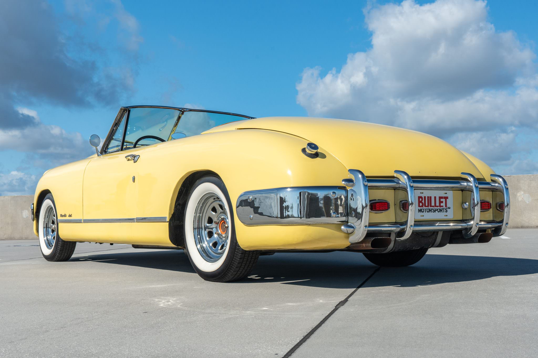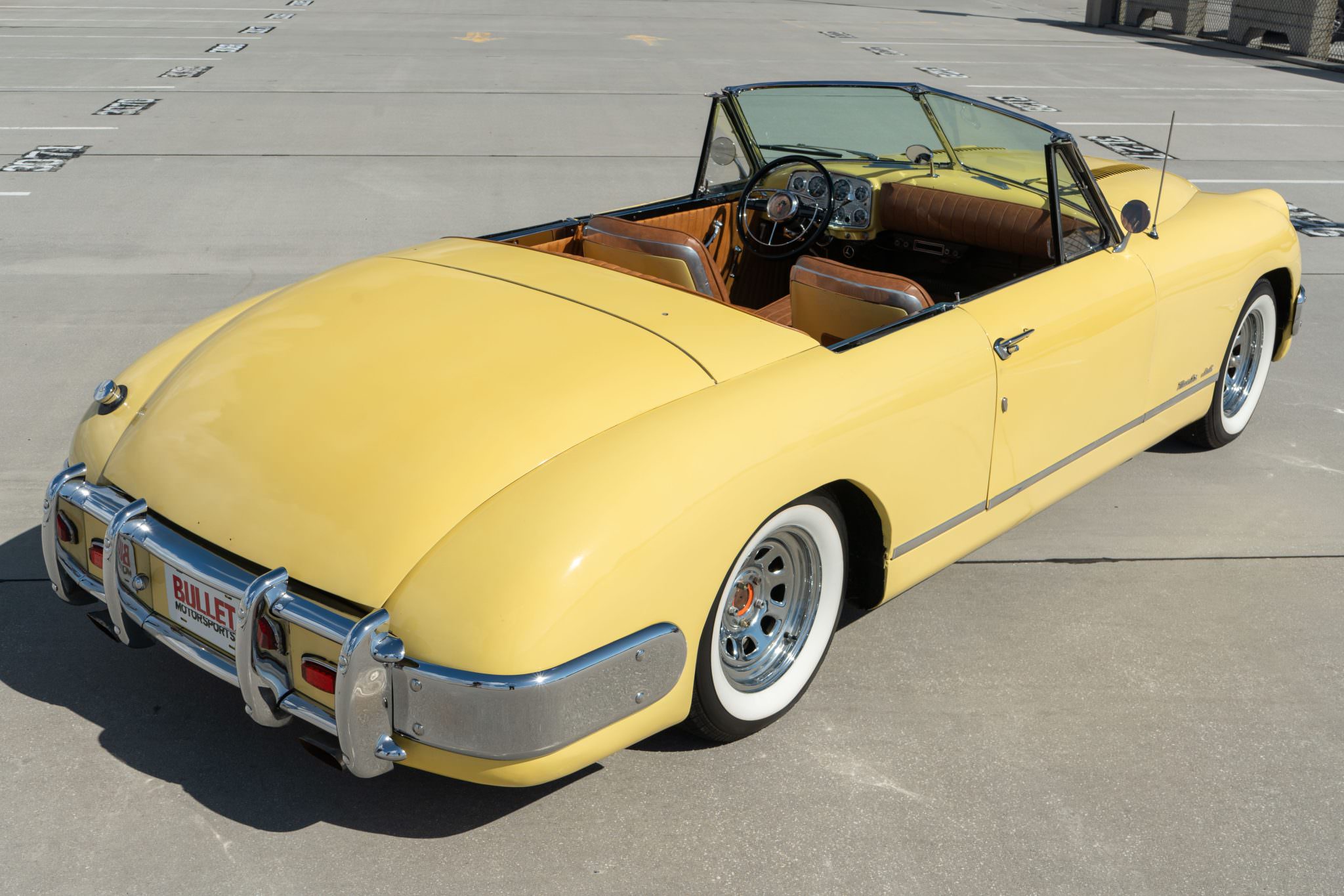 This 1951 Muntz Jet has been significantly modified from stock, the original drivetrain has been replaced with a 350 cubic inch (5.7 liter) V8 paired with a 700R4 4-speed automatic transmission and a Ford 9-inch rear end.