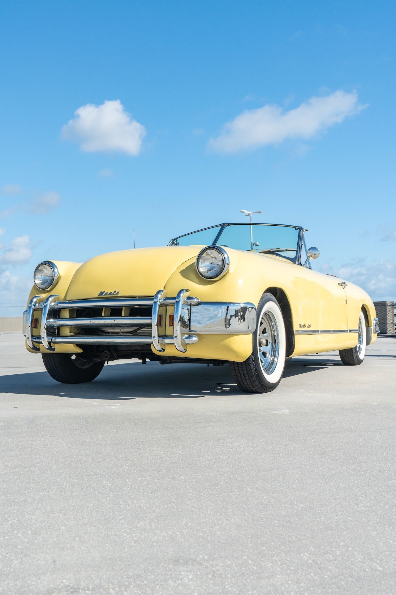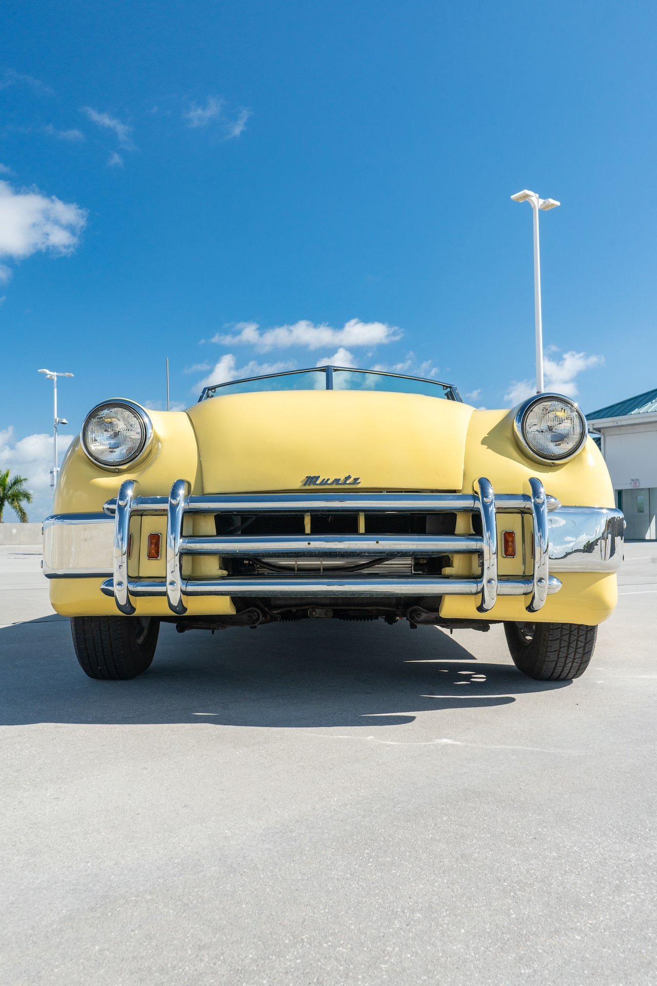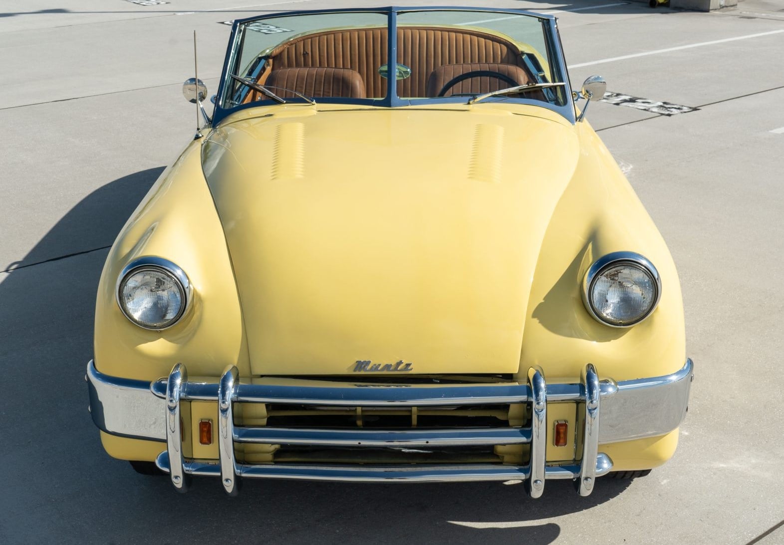 The body is finished in yellow and keeps all the classic Muntz Jet styling cues, like chrome wraparound bumpers, a louvered hood, and a split windshield. It rides on 15 inch chrome wheels with whitewall radials, and a set of chrome wire wheel covers with “Madman” Muntz medallions is included along with a removable top frame.