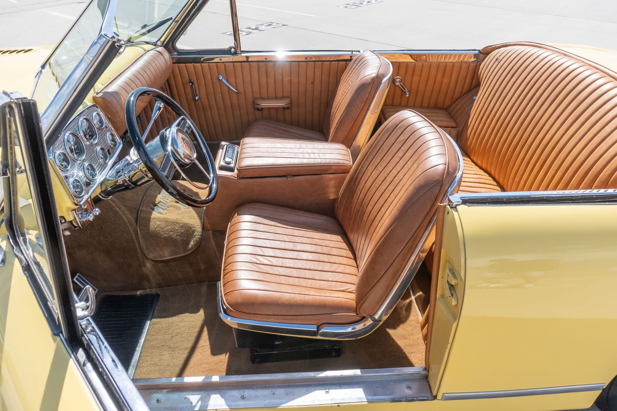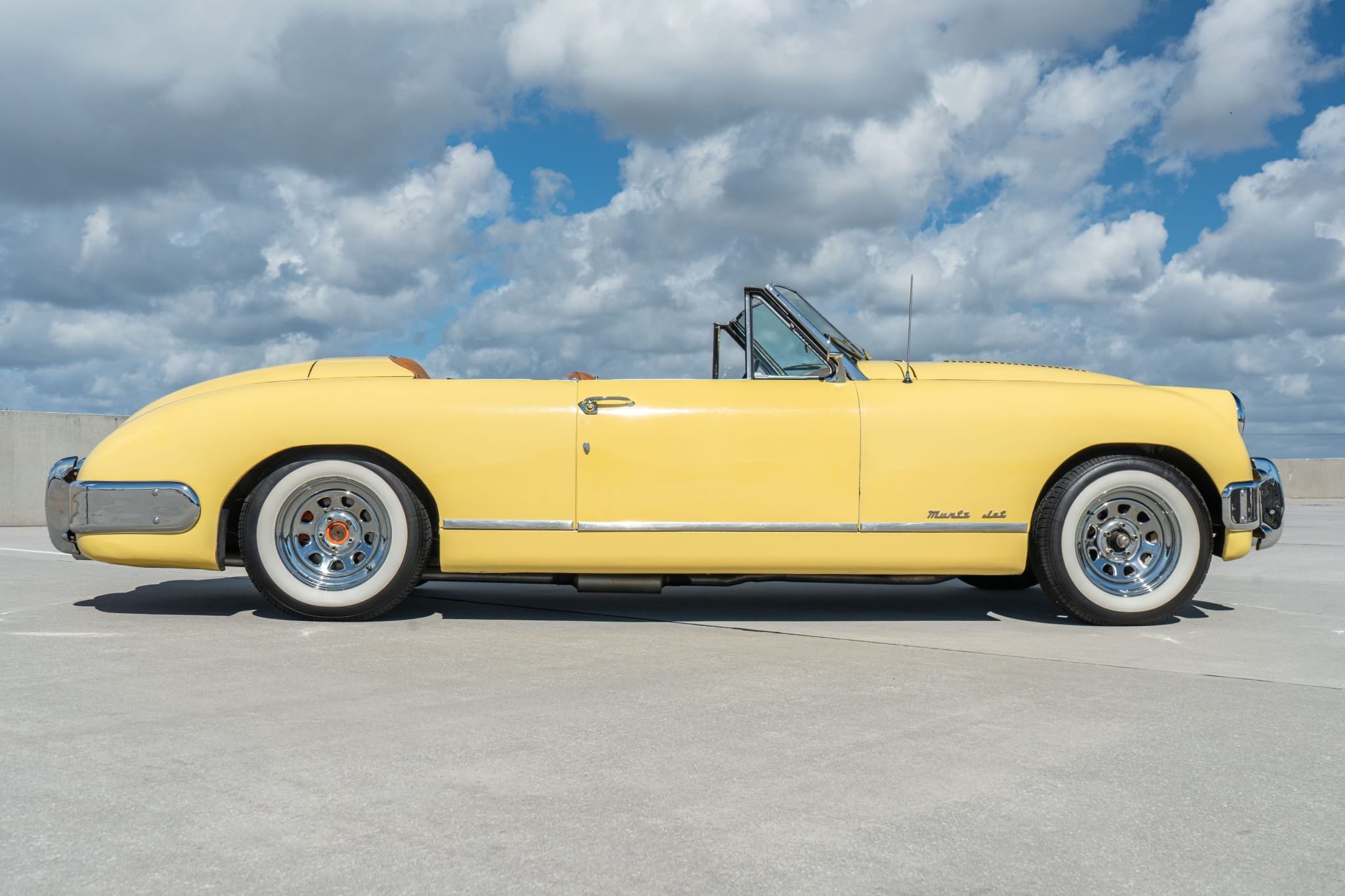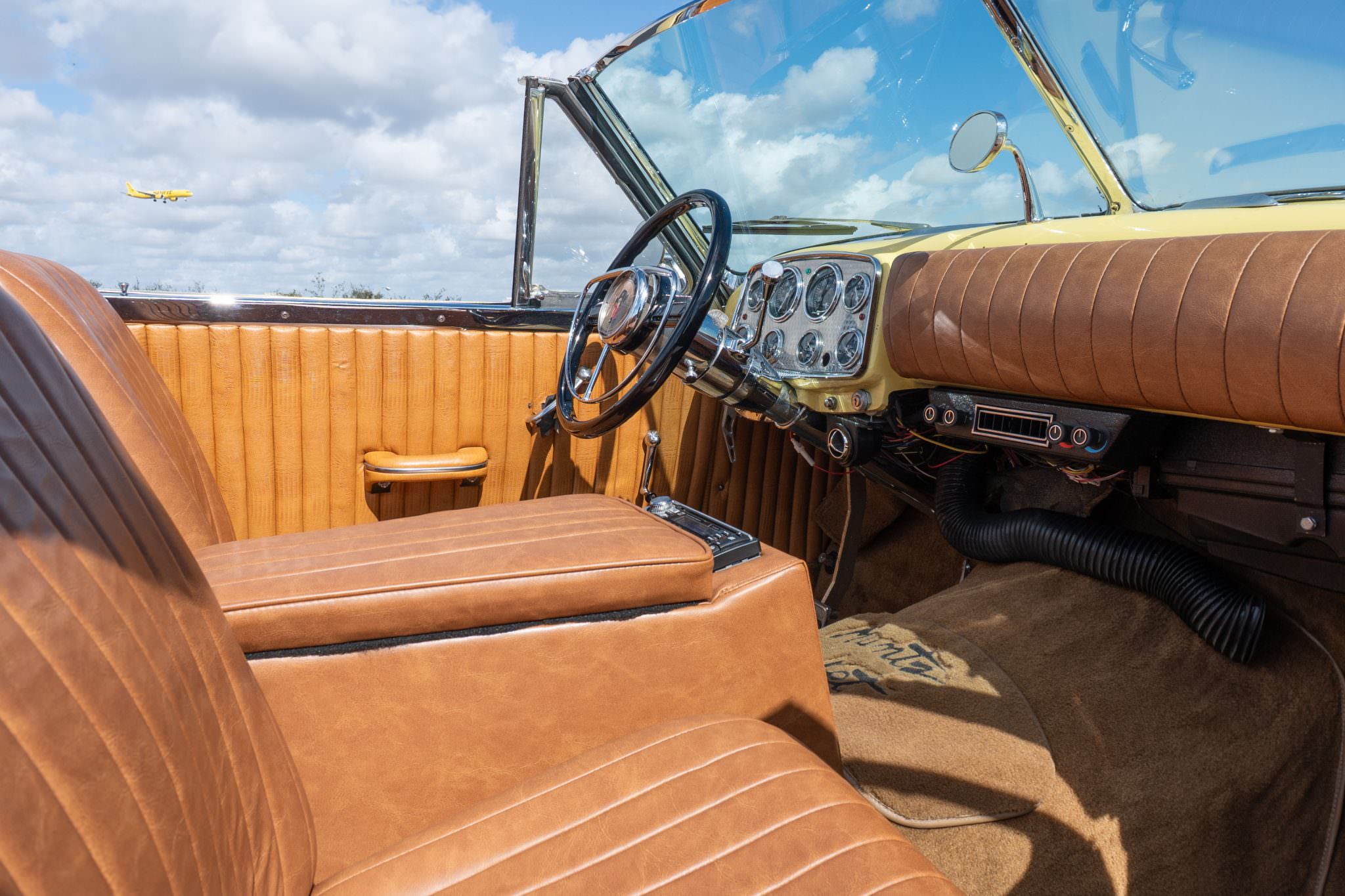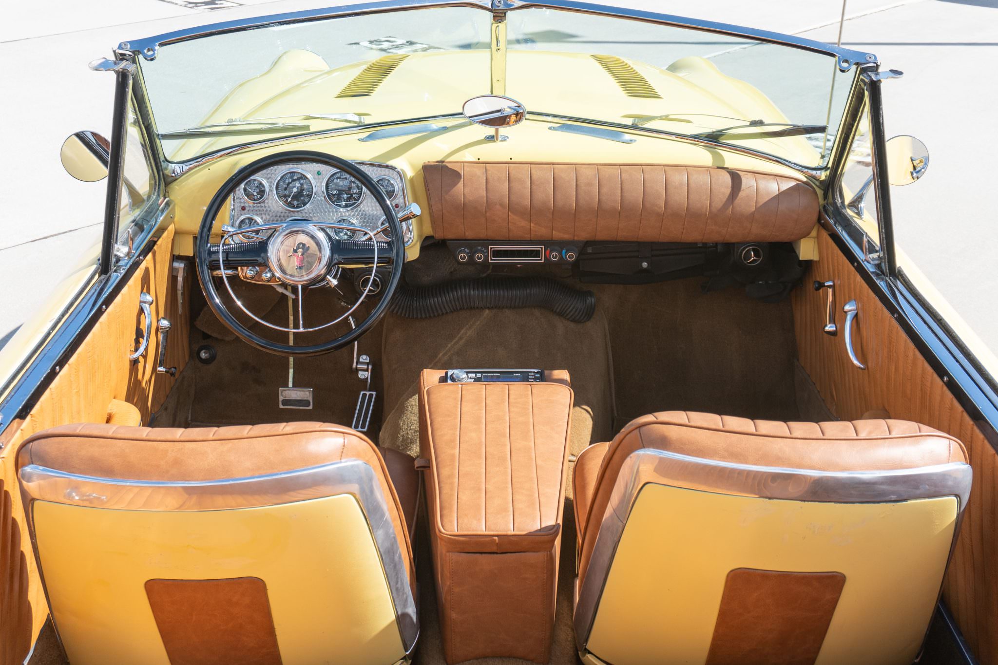 The body is finished in yellow and keeps all the classic Muntz Jet styling cues, like chrome wraparound bumpers, a louvered hood, and a split windshield. It rides on 15 inch chrome wheels with whitewall radials, and a set of chrome wire wheel covers with “Madman” Muntz medallions is included along with a removable top frame.