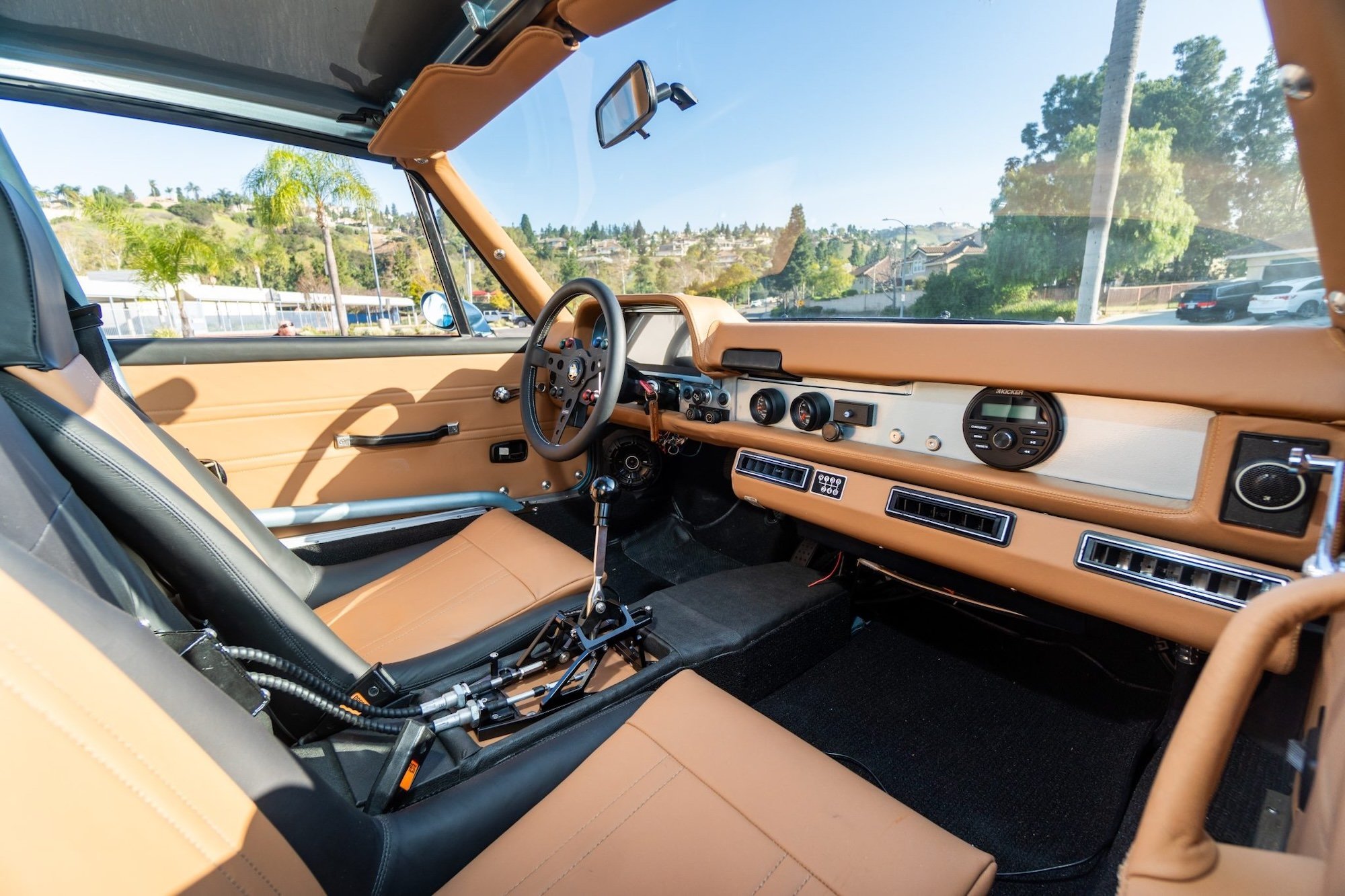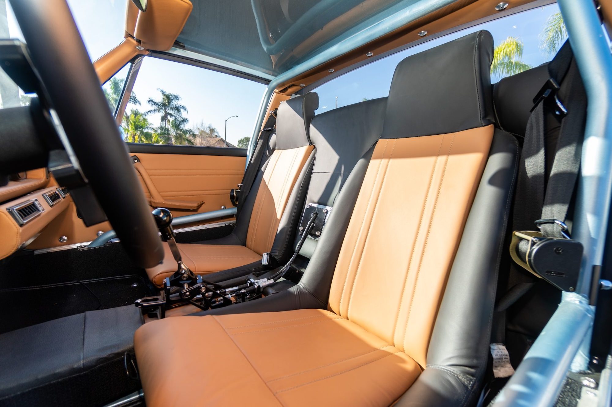 Inside, the cabin has reupholstered two-way adjustable bucket seats trimmed in black leather with tan centers, with matching leather extending across the dashboard. Equipment includes a body-color roll bar, Numeric Racing shifter and cables, air conditioning, and a Kicker Bluetooth stereo system.