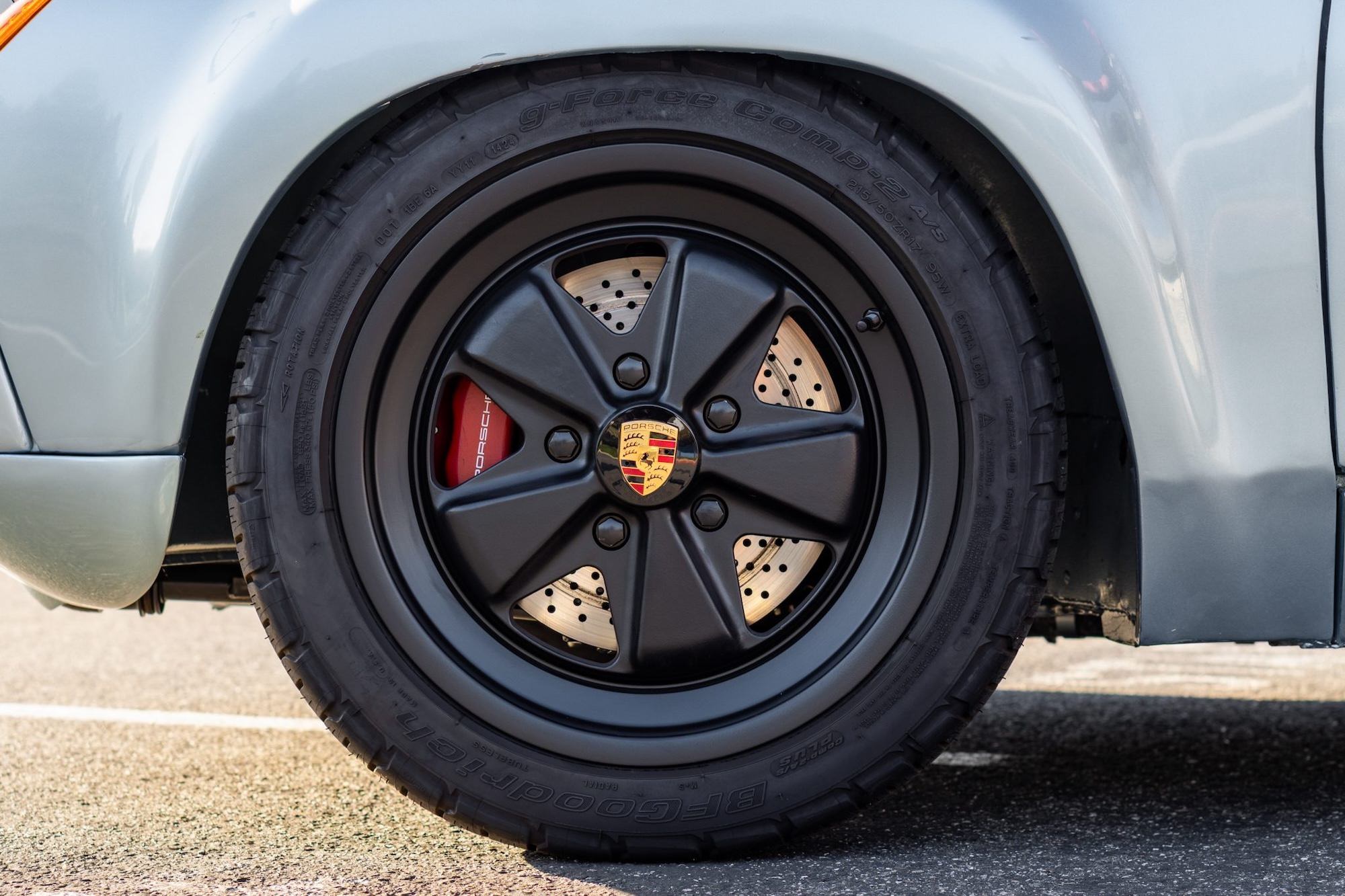 Power is sent to the rear wheels through a 986 Boxster S 6-speed manual transaxle paired with a Wavetrac limited-slip differential, and a Wilwood clutch master cylinder has been added. The car rides on staggered 17 inch Fuchs-style wheels, measuring 9 inches wide up front and 11 inches at the rear, shod with 215/50 and 245/45 BFGoodrich G-Force tires.