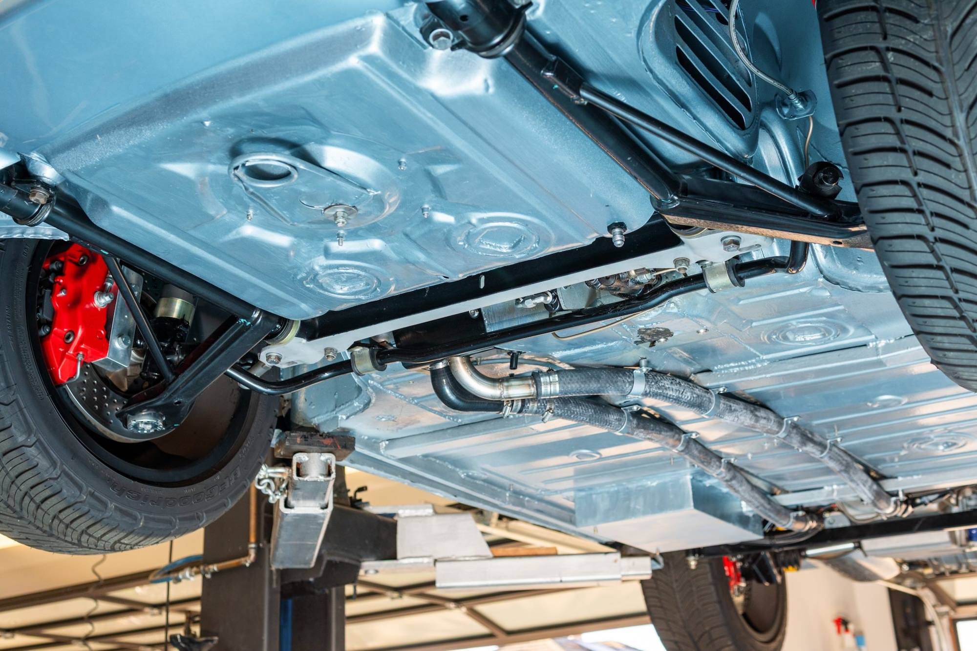 - The body was stripped to bare metal, repaired as needed, fitted with steel fender flares, and refinished in Marathon Blue Metallic including the removable targa top. It rides on staggered 17 inch Fuchs-style wheels, 9 inches front and 11 inches rear, shod with 215/50 and 245/45 BFGoodrich G-Force tires.