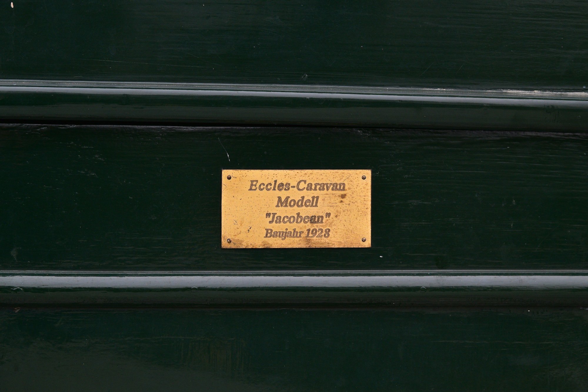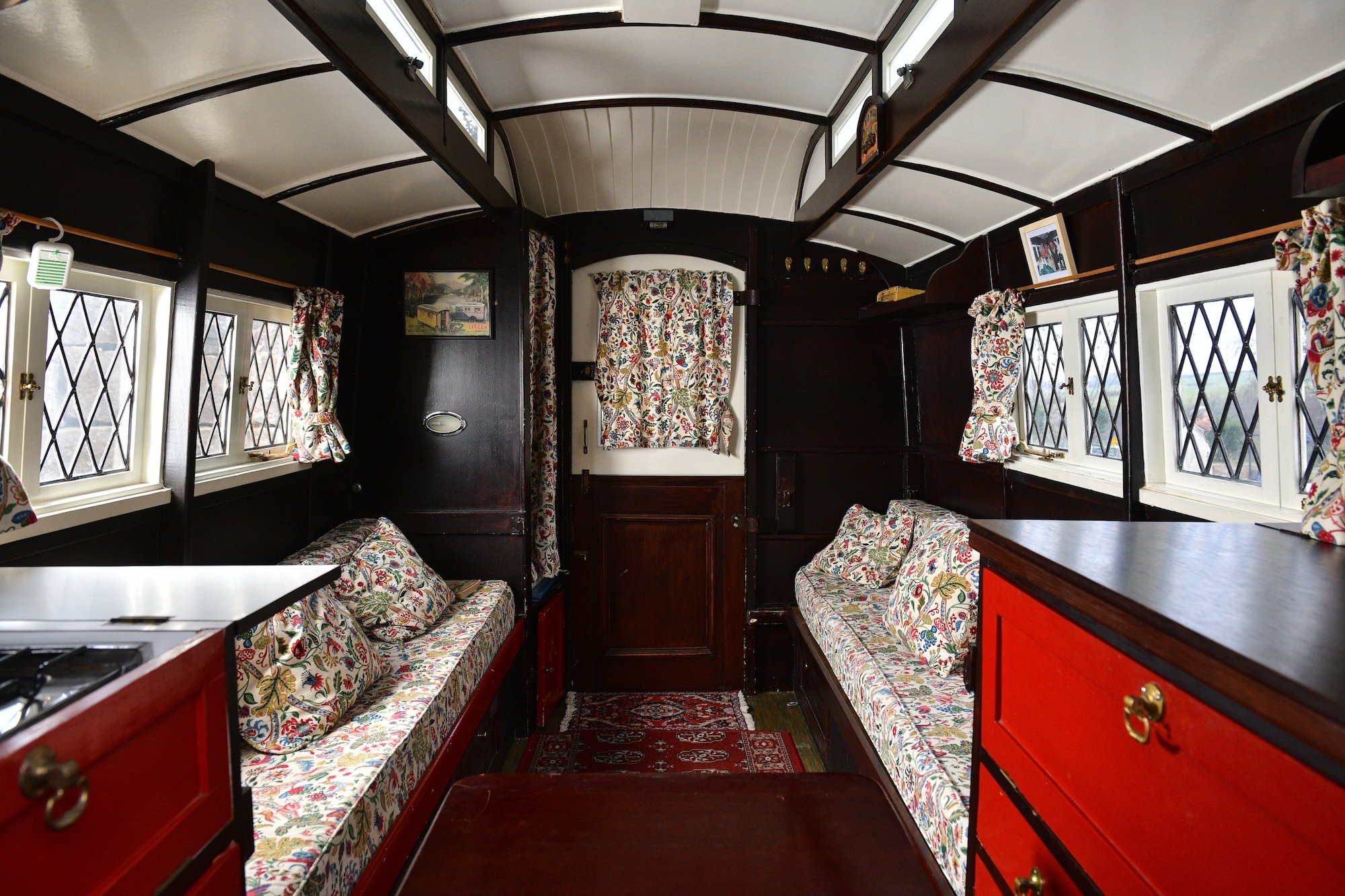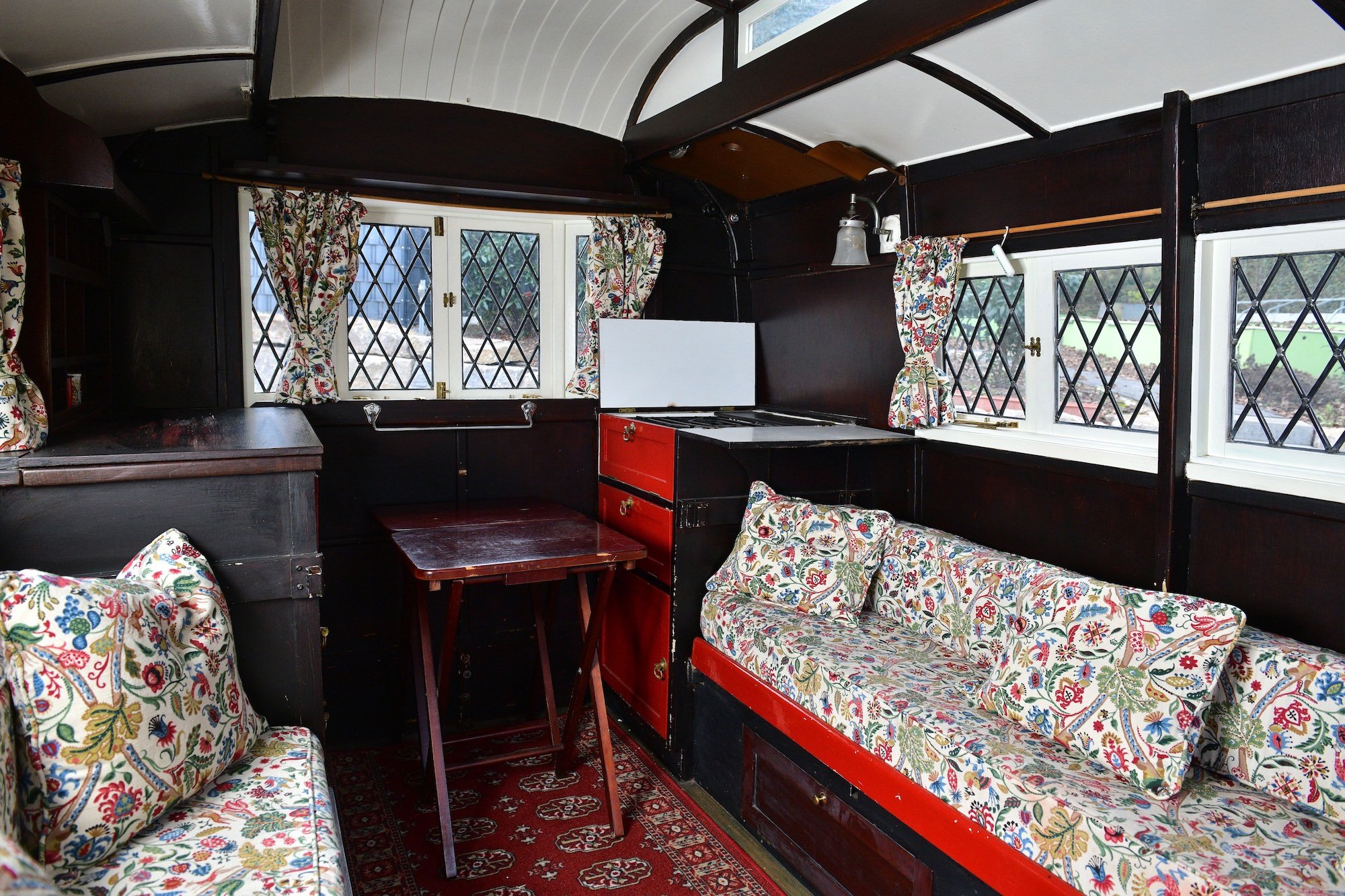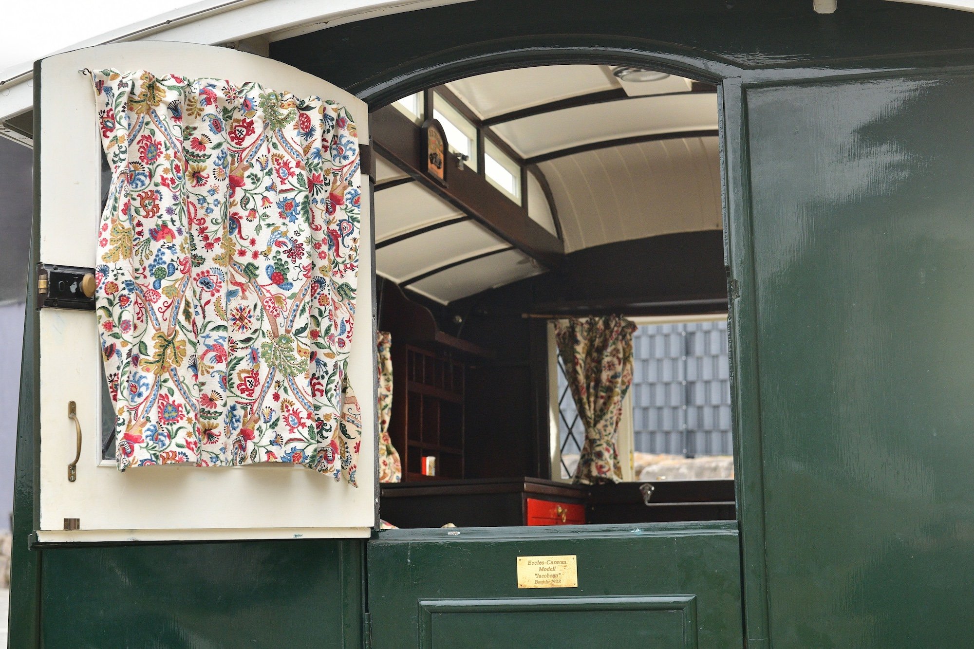 - This 1928 Eccles Jacobean Caravan is an early luxury touring caravan styled after English Tudor architecture, with a lantern roof, bay windows, and rear access door. Its interior has a gas stove kitchenette, convertible sofa beds, storage, carpeted floors, light fittings, and curtains, a sign of early leisure travel requirements.