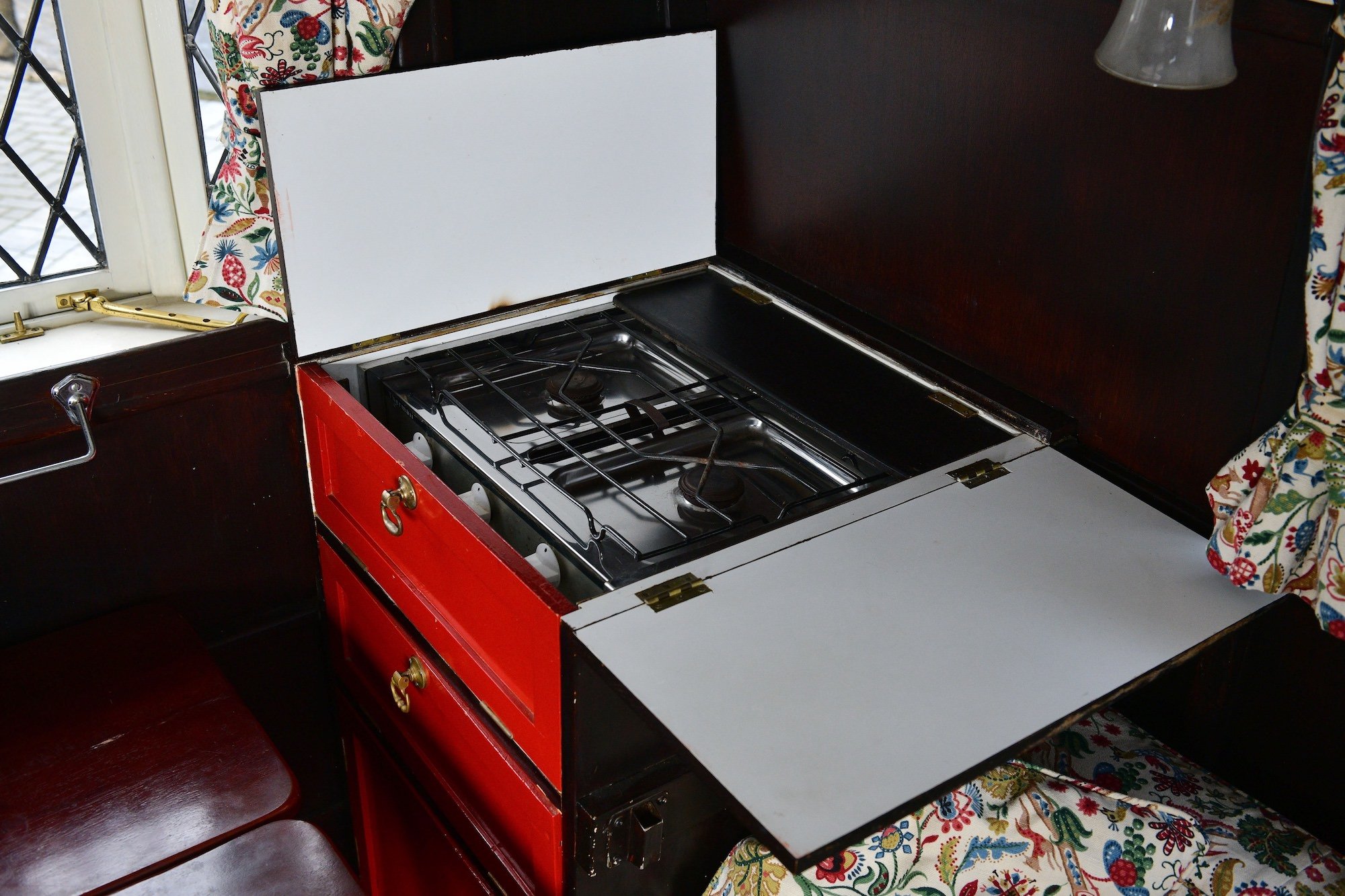 Inside you’ll find a gas stove in a simple kitchenette, two sofas that convert into single beds, some counter top and storage space, carpeted floors, and there are light fittings as well as curtains on the windows.