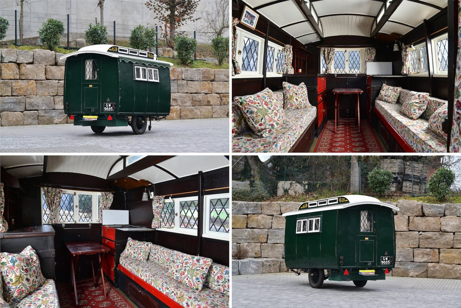 This is a rare Eccles Jacobean Caravan from 1928 with styling inspired by classic English Tudor architecture. It has a lantern roof, bay windows, a period-correct interior, and a rear access door with a step.
