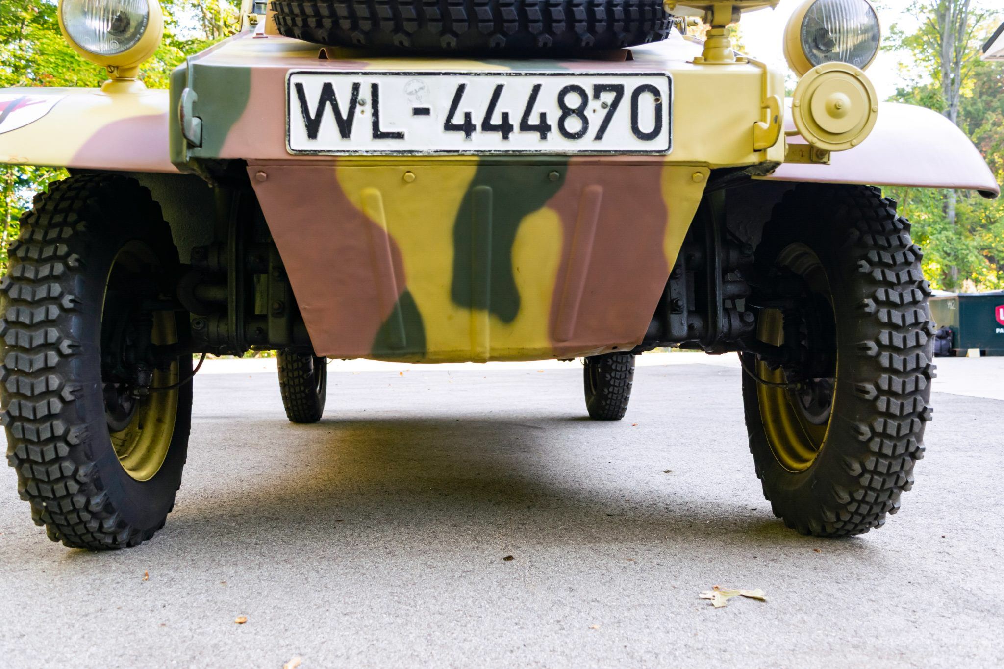 This Kübelwagen is finished in yellow with brown and green camouflage, it retains many of its wartime design elements including a folding windshield, canvas soft top, and seat cushions accompany front and rear Notek blackout lights, a convoy light array, and fender-mounted headlights.