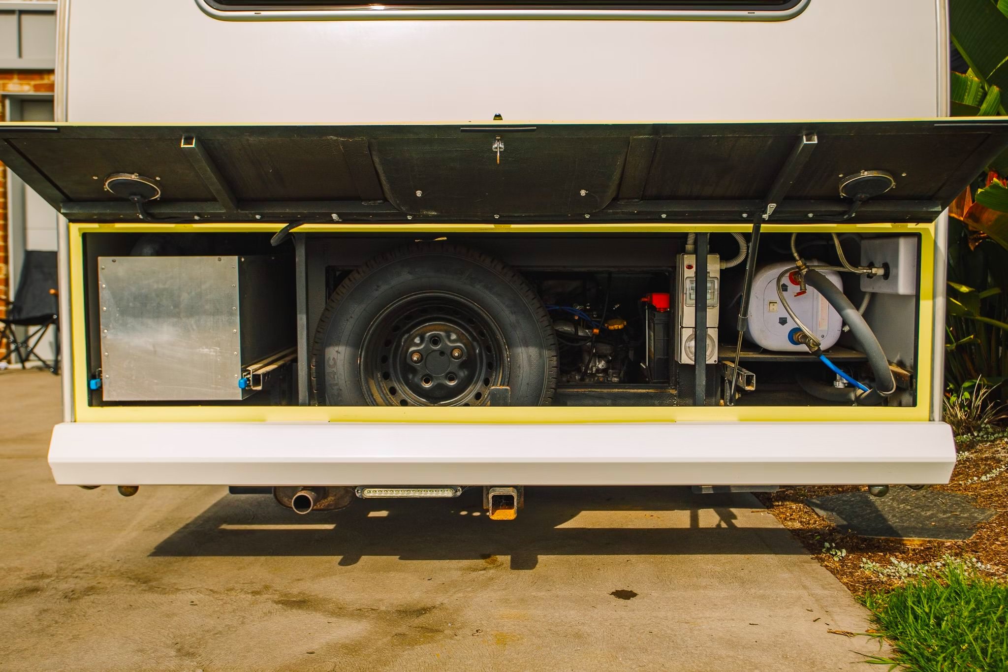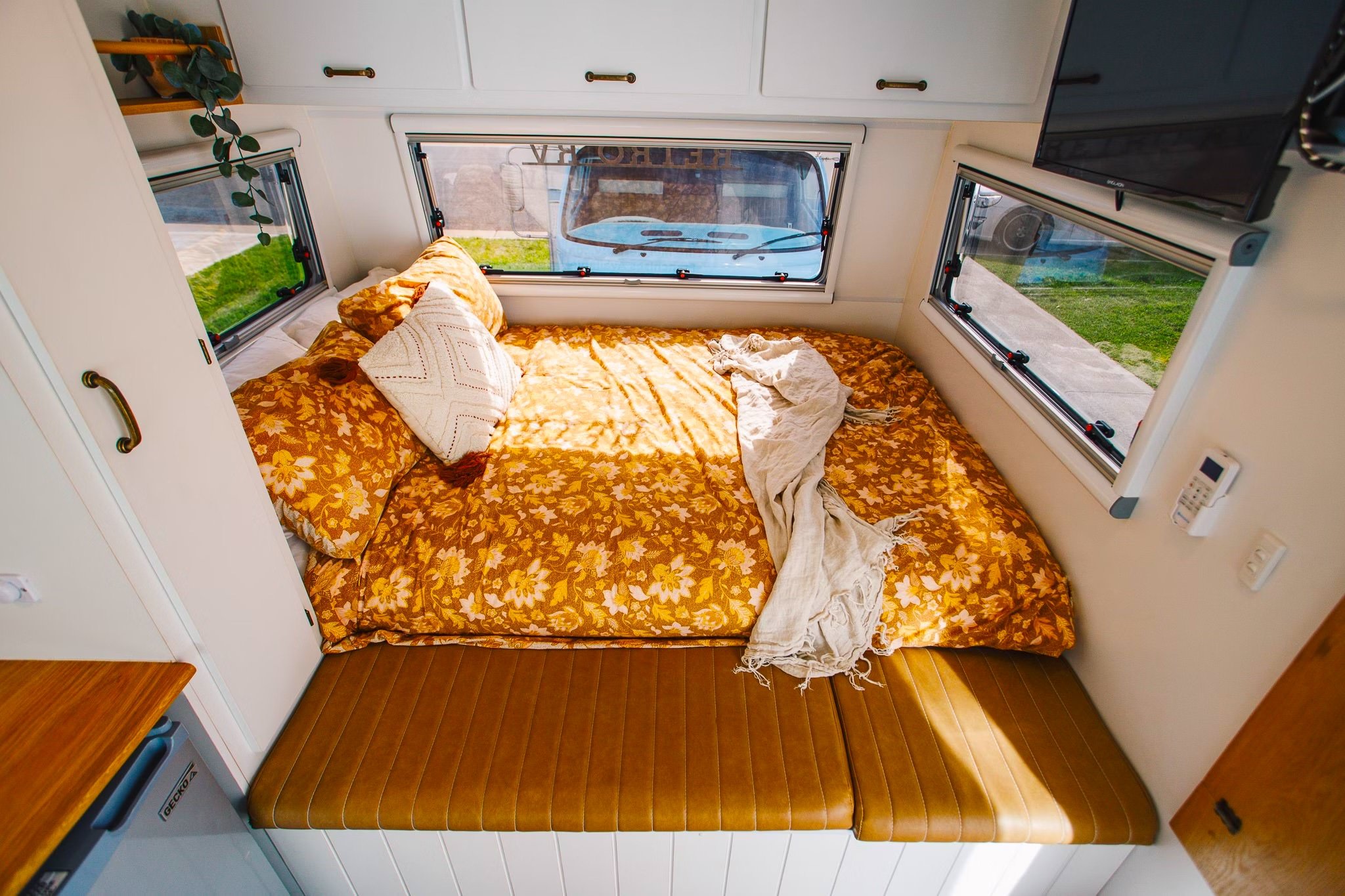 In the motorhome section in the rear you’ll find 240 volt power outlets, a mains water connection with hot water capability, an outside shower, a rollout awning, a rear-view camera, air conditioning, and a double bed with innerspring mattress.