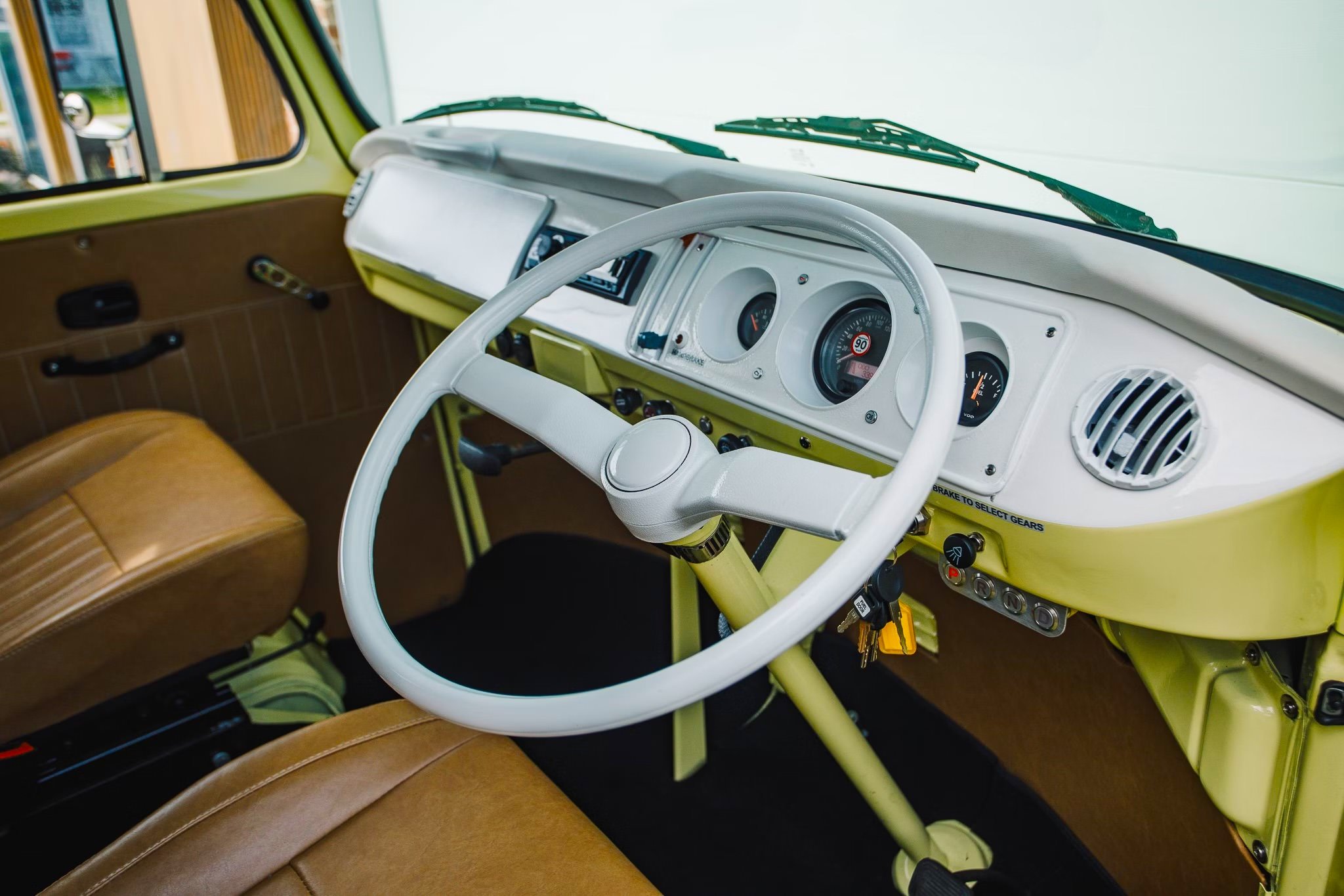 Power is sent to the rear wheels )as it is with the vintage Kombis of course) but everything from the braking to the wiring harness is modern. The chassis design is proprietary, engineered to handle the increased power output while maintaining classic Type 2 proportions.