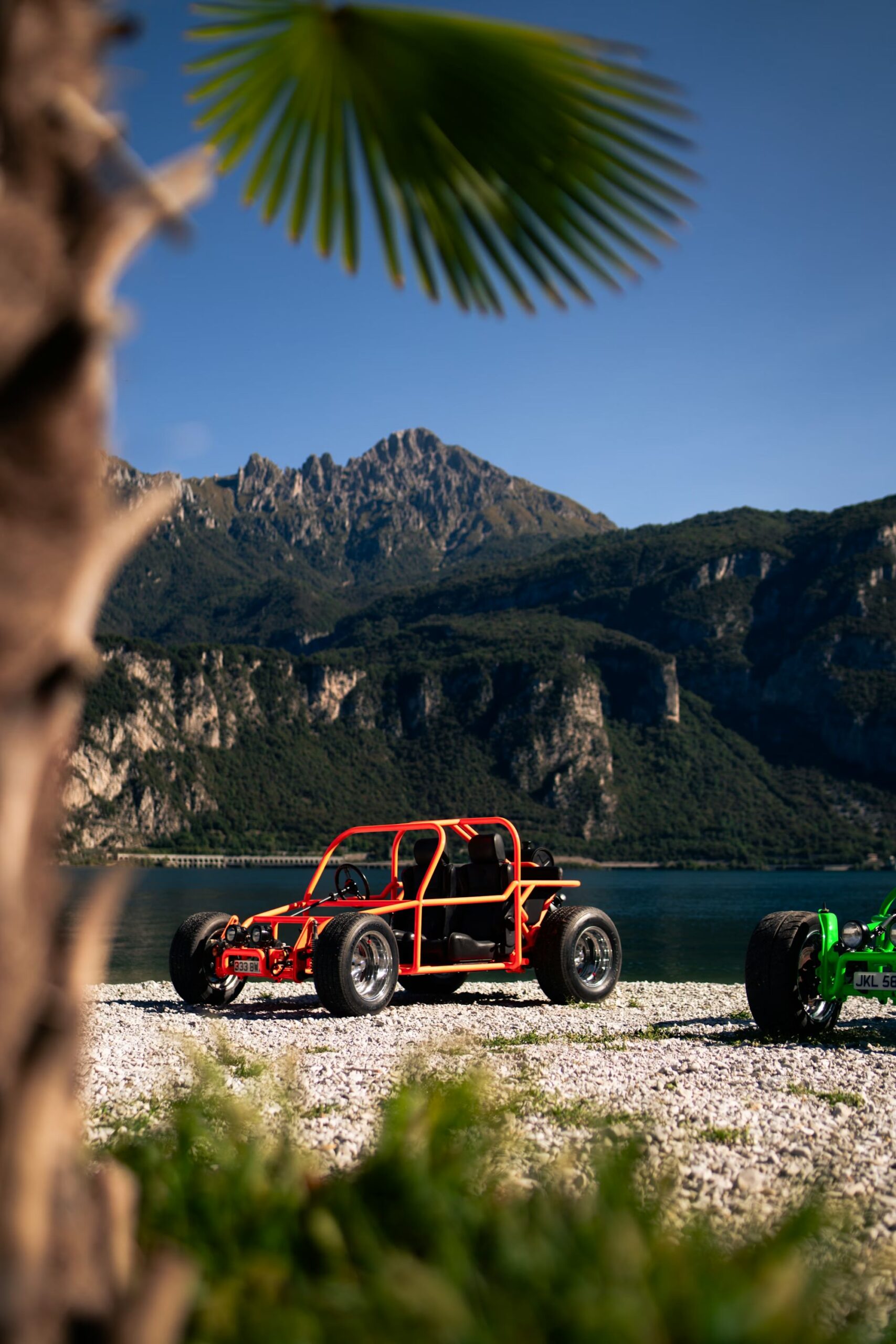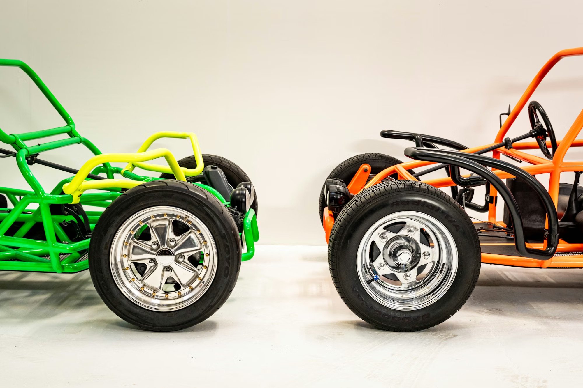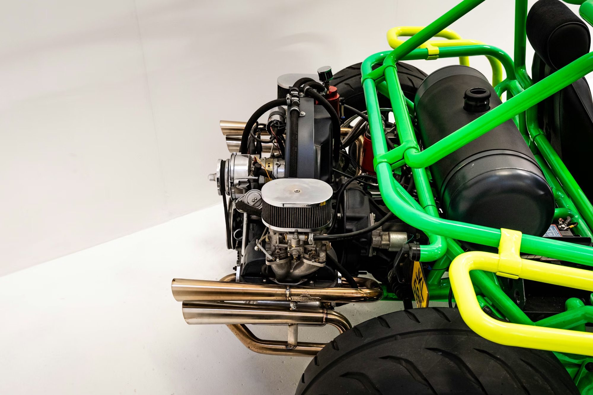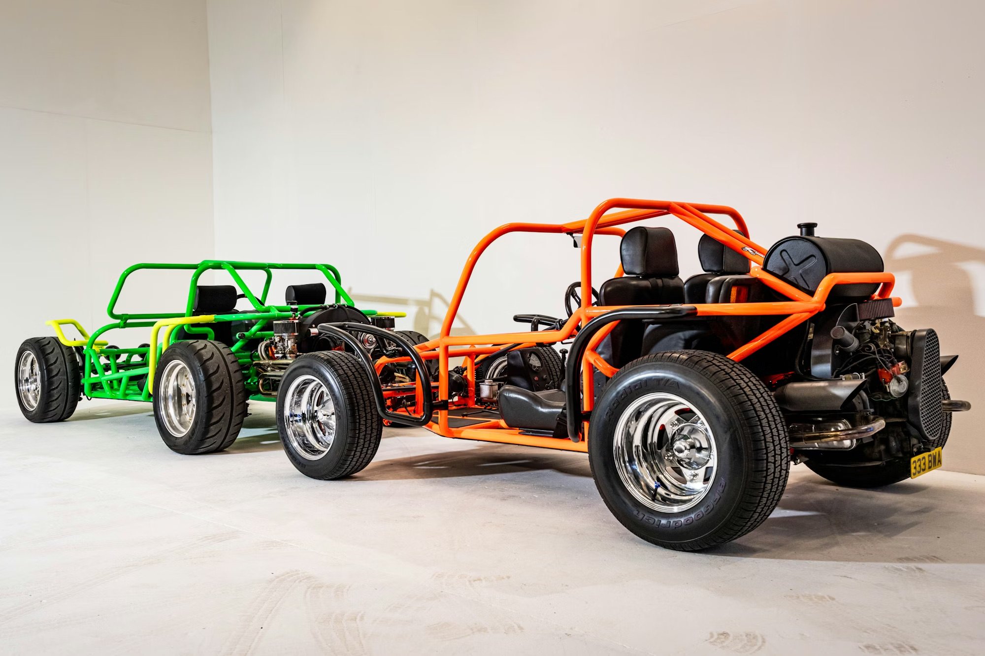 The two buggies are finished in Green/Yellow and Orange/Black. They’re powered by 1.3 liter and 1.9 liter VW flat-four, air-cooled engines respectively, and the Green/Yellow buggy also benefits from the fitment of independent rear suspension (as opposed to the earlier swing axle rear) and a “Freeway Flyer” gearbox with upgraded internals better suited for modern highway driving.