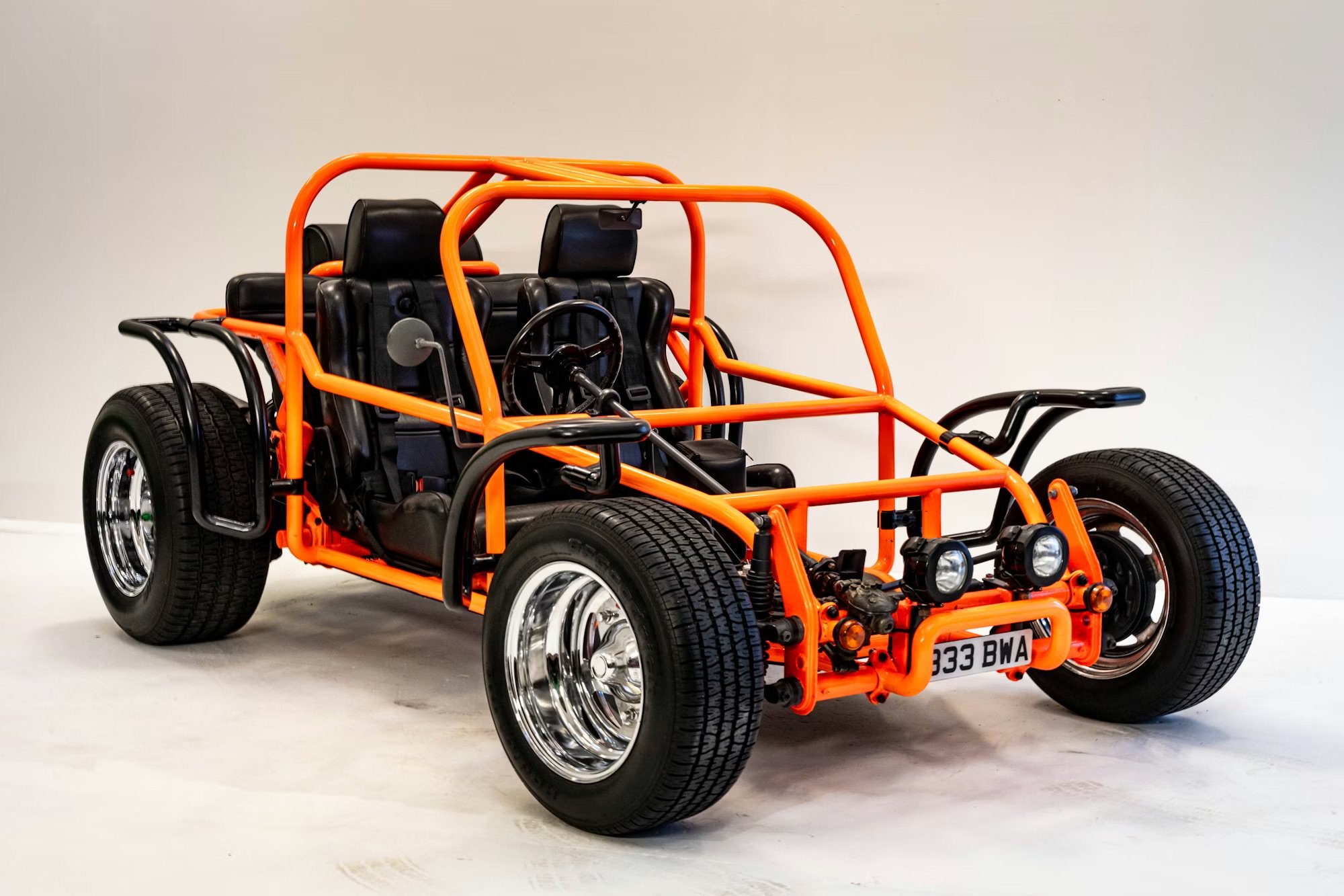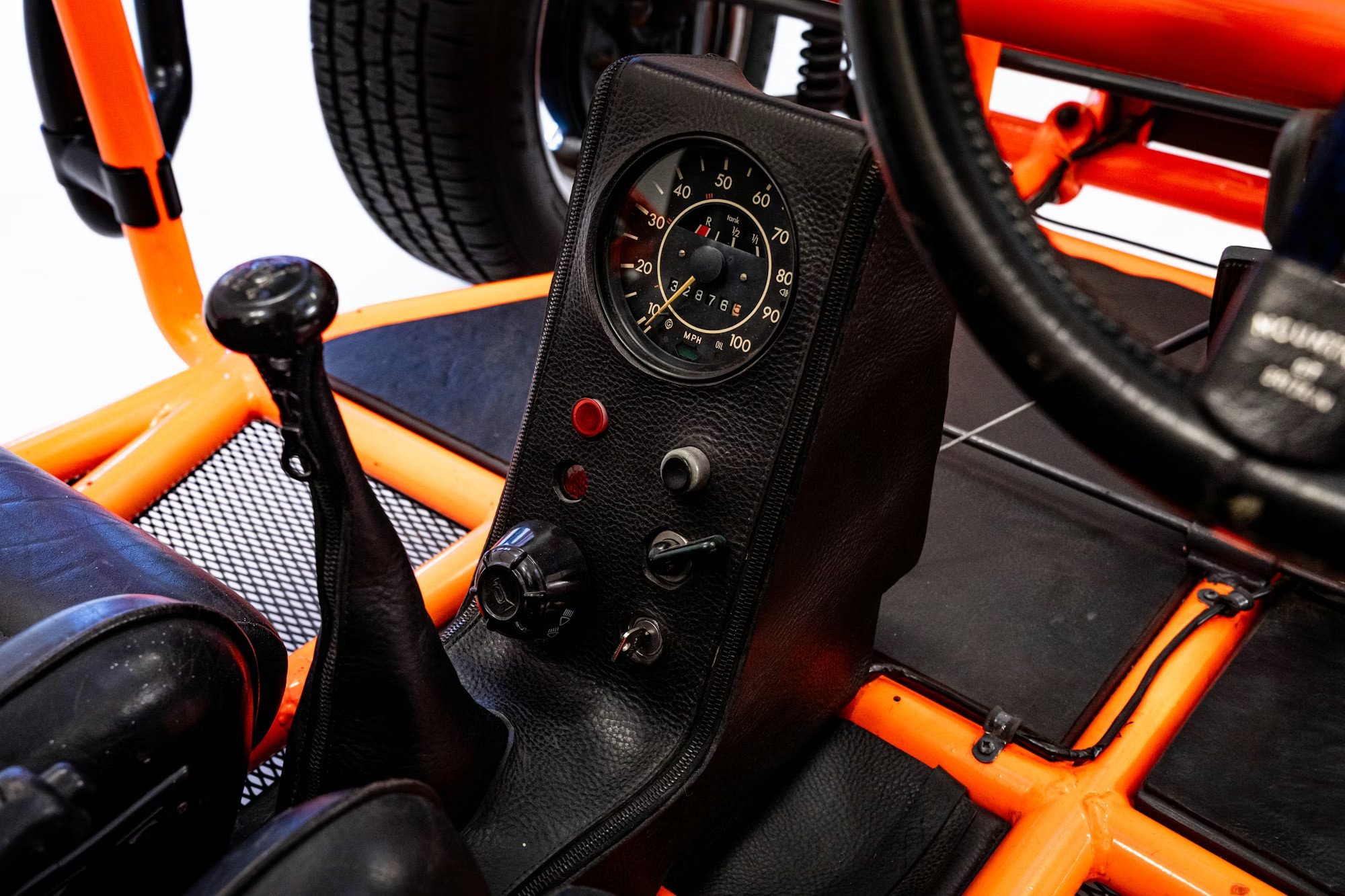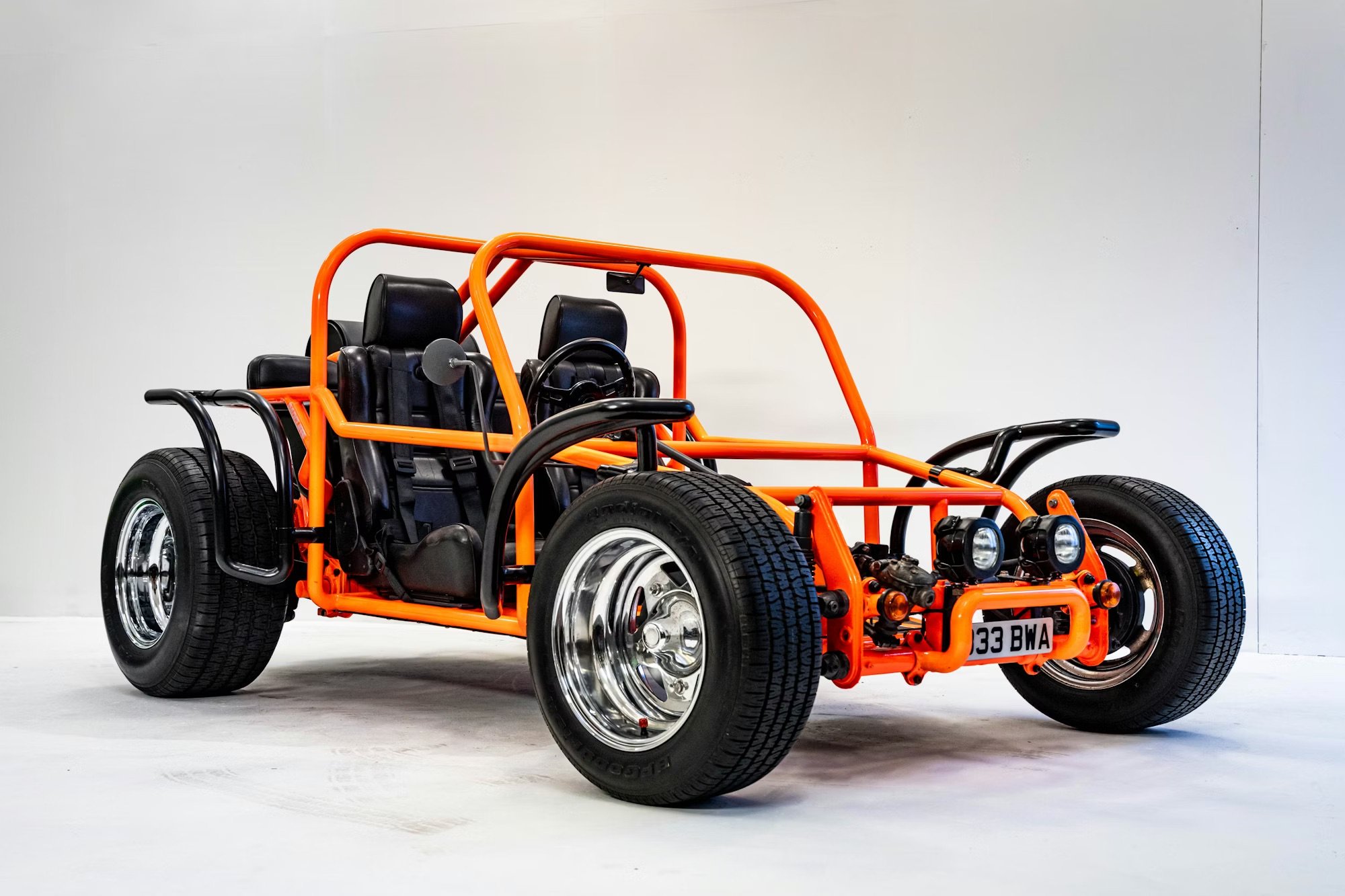 Inside is a relative term when it comes to vehicles like this of course, but inside the Green buggy you’ll find black leatherette and corduroy cloth-trimmed Porsche RSR-style seats. Inside the Orange buggy you’ll find black leather-trimmed Scheel-Mann front seats plus a rear bench seat, with a black leatherette-trimmed centre console and floor panels.
