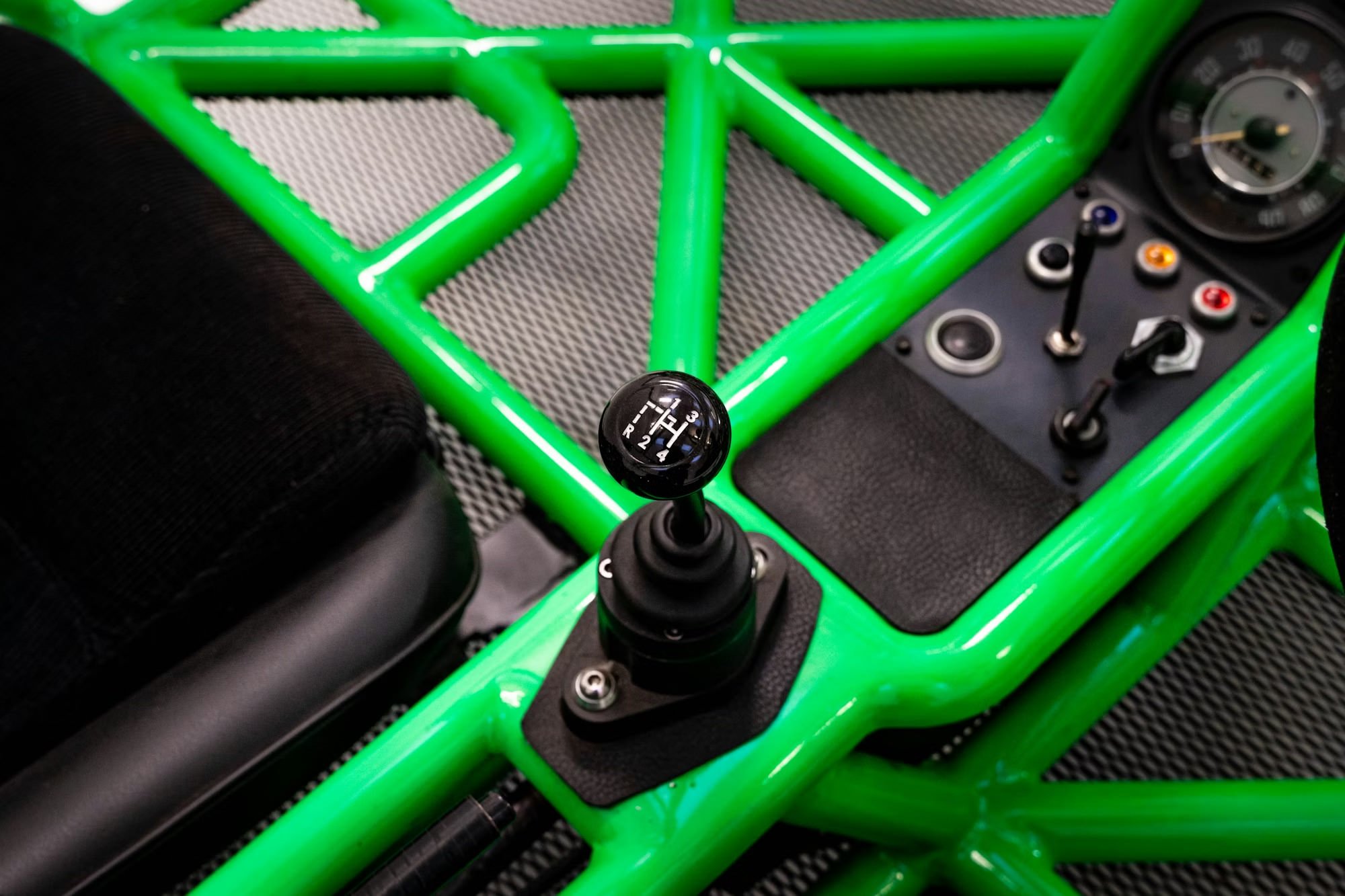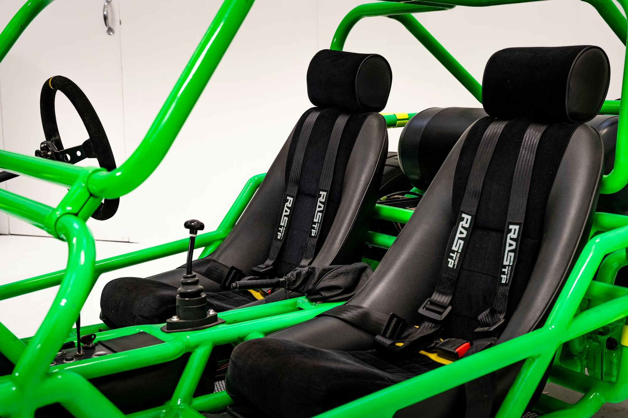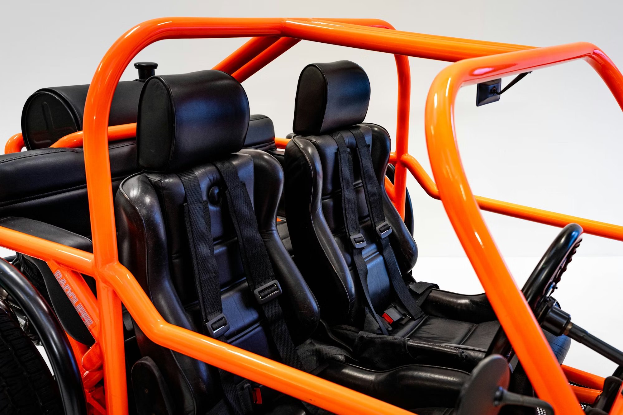 Inside is a relative term when it comes to vehicles like this of course, but inside the Green buggy you’ll find black leatherette and corduroy cloth-trimmed Porsche RSR-style seats. Inside the Orange buggy you’ll find black leather-trimmed Scheel-Mann front seats plus a rear bench seat, with a black leatherette-trimmed centre console and floor panels.