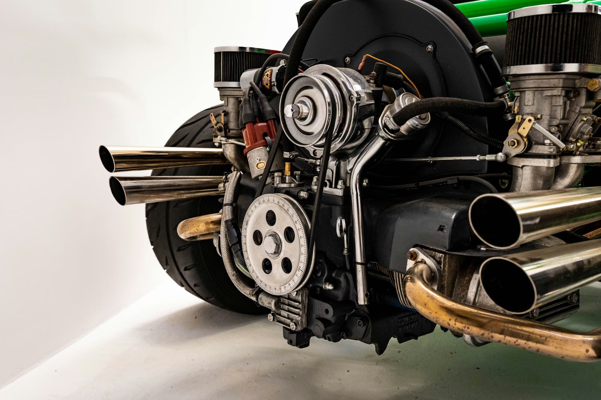 Of the two vehicles, the Green buggy is by far the quickest, thanks to a series of major mechanical upgrades. It’s powered by a 1.9 liter VW engine with an Autolinea race case with 94mm pistons, an 86mm counterweight crankshaft, 5.4 inch I-beam con rods, an Engle FK8 camshaft with 30mm followers, CB Performance Panchito big valve cylinder heads, 1.4:1 ratio rockers with bolt-up shafts, and 44 IDF carburetors.