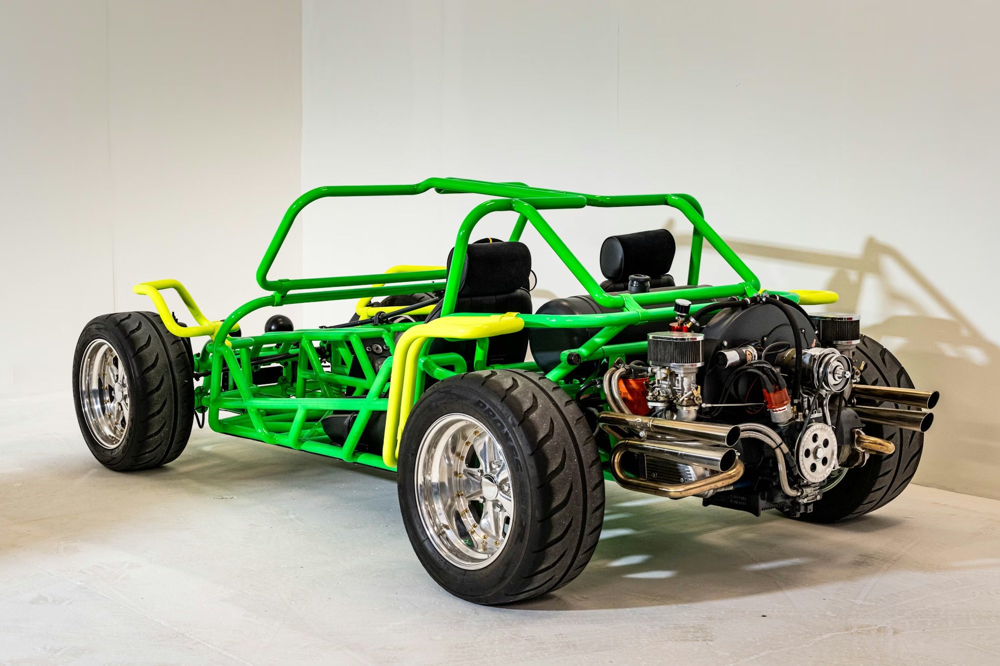 Of the two vehicles, the Green buggy is by far the quickest, thanks to a series of major mechanical upgrades. It’s powered by a 1.9 liter VW engine with an Autolinea race case with 94mm pistons, an 86mm counterweight crankshaft, 5.4 inch I-beam con rods, and much, much more.