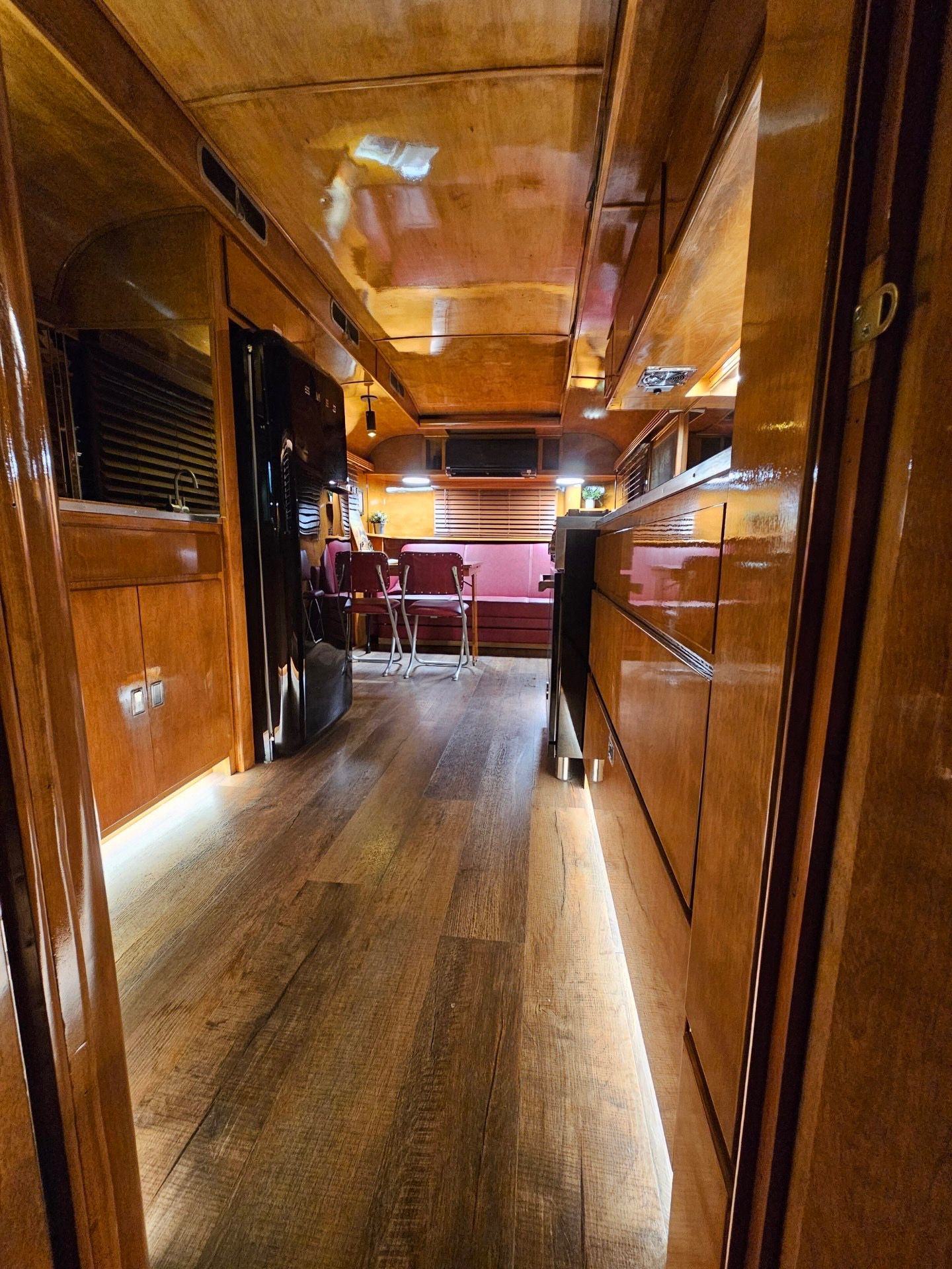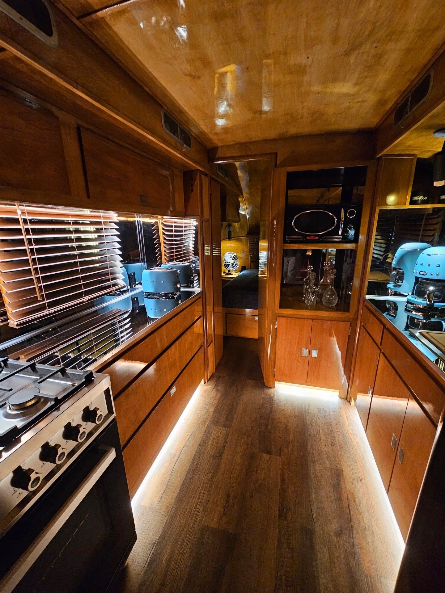 The interior is paneled and furnished in pecan-stained Russian birch wood finished under multiple coats of clear, replicating the original cabinetry using period-correct hardware. At the rear, the sleeping quarters contain a custom bed fitted with a contoured memory-foam mattress.