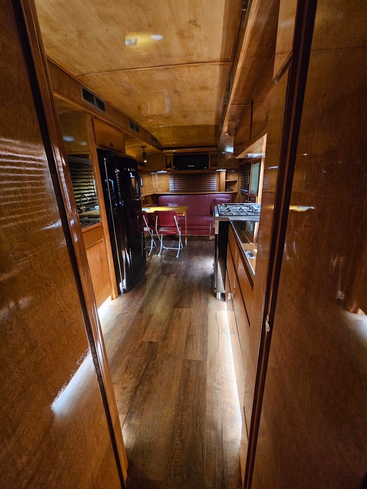 Inside, the Sequoia was entirely rebuilt with new wiring, plumbing, spray-foam insulation, and sub-flooring, overlaid with new vinyl flooring. The interior is paneled and furnished in pecan-stained Russian birch wood finished under multiple coats of clear, replicating the original cabinetry using period-correct hardware. At the rear, the sleeping quarters contain a custom bed fitted with a contoured memory-foam mattress.