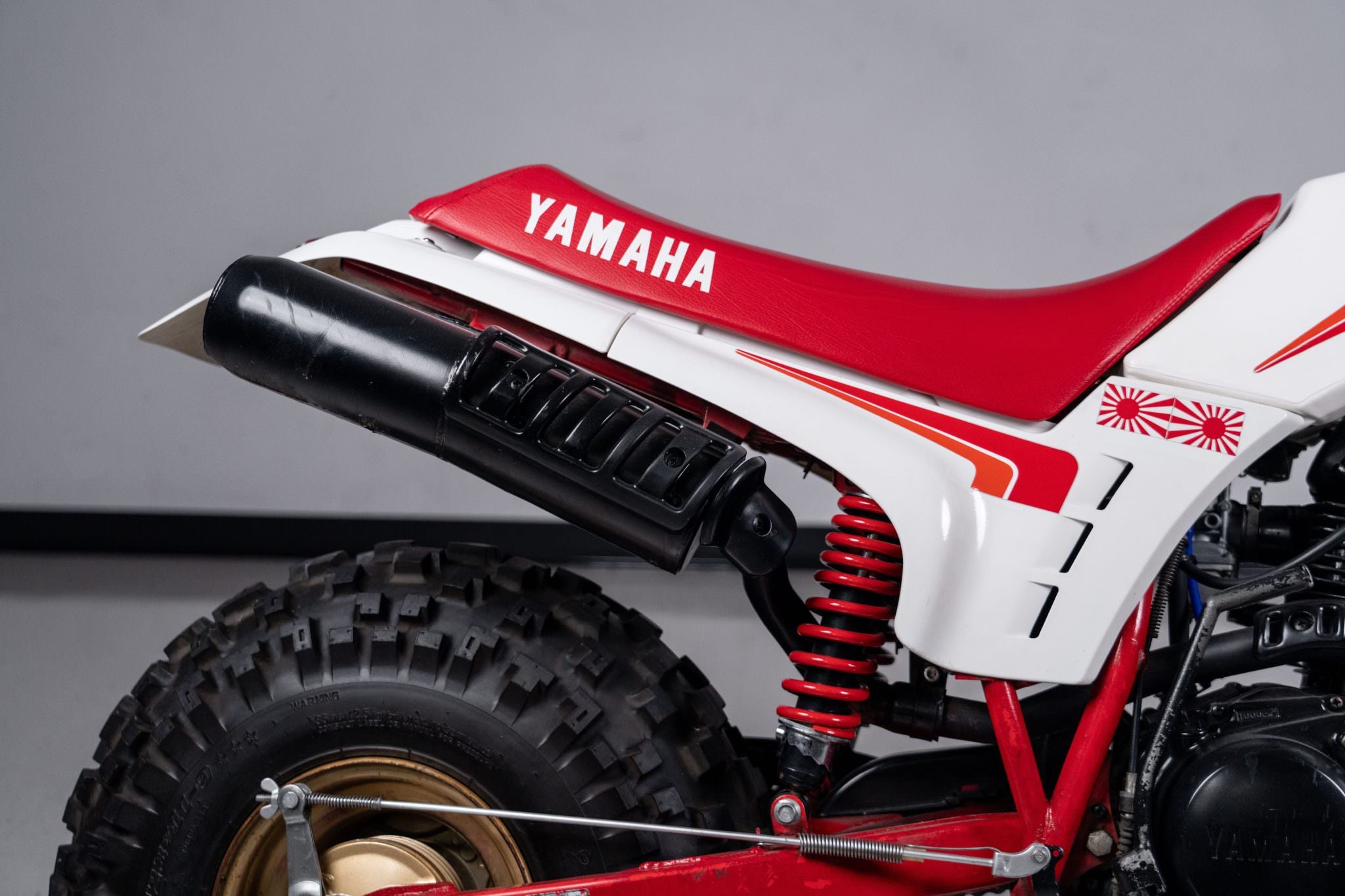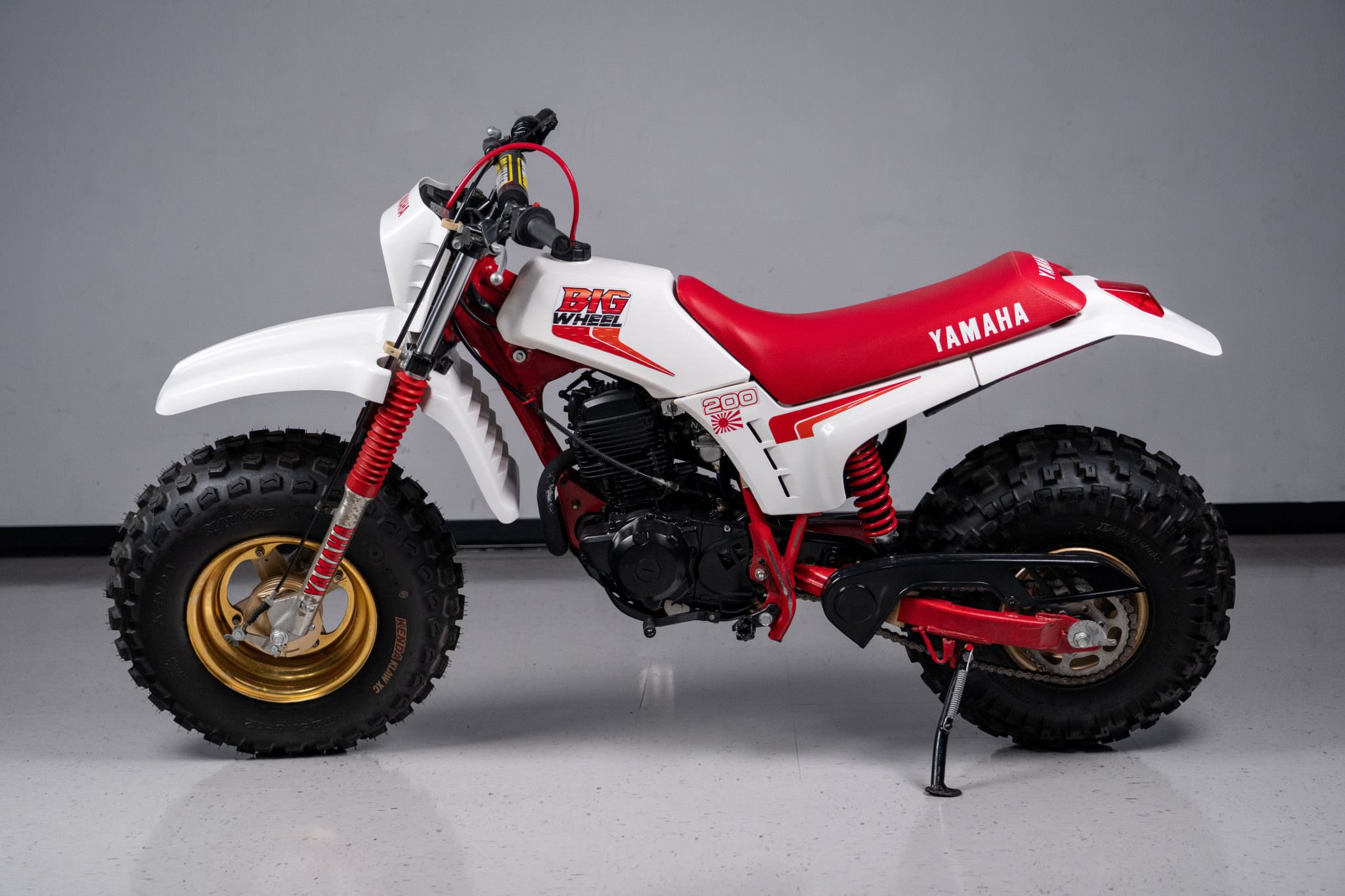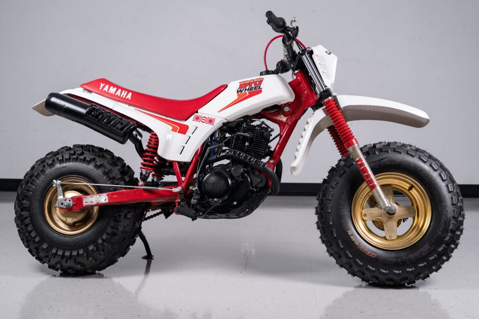 Gold-finished wheels measure 12 inches up front and 9 inches out back, wearing Kenda and Dunlop knobby tires respectively. Suspension consists of a telescopic fork with red Yamaha graphics and dual shocks in the rear mounted to the swingarm and frame.